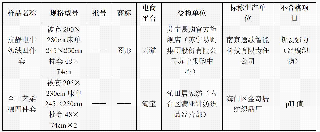 南京市市场监管局4月14日发布了床上用品质量监督抽查结果,本次共抽查了20批次产品,其中有2批次不合格,不合格项目为断裂强力(经编织物),pH值。