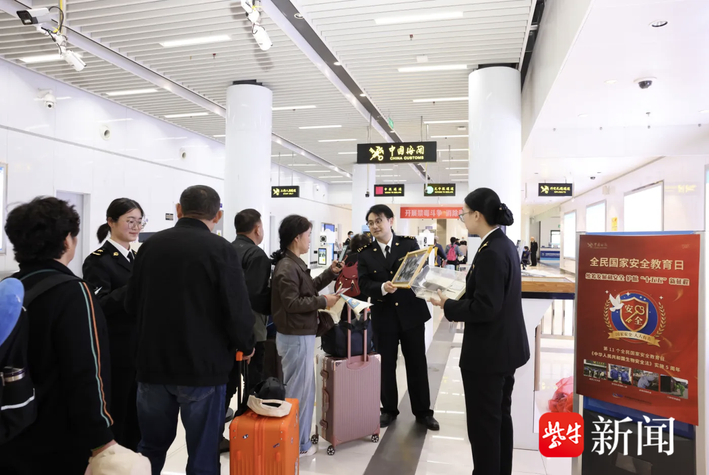 在中韩轮渡客运站旅检通关大厅,连云港海关工作人员向进出境旅客宣讲国门生物安全知识,并邀请口岸从业人员参观病媒生物科普馆。