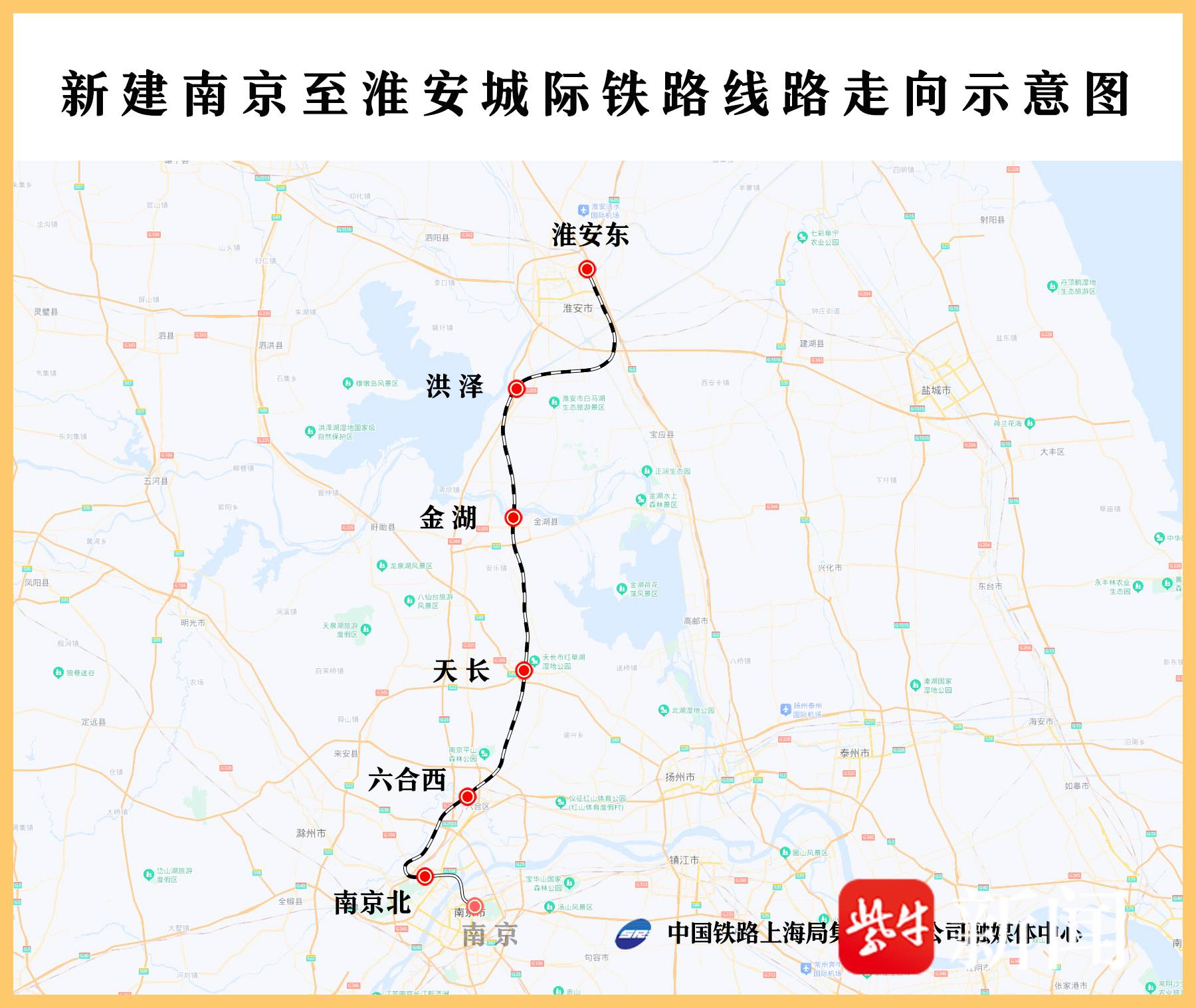 宁淮城际铁路自北向南由江苏省淮安市淮安东站引出,跨过京杭大运河,经淮安市洪泽区、金湖县、安徽省天长市、江苏省南京市六合区,引入新建南京北站,新建线路全长179公里,其中江苏段长134公里,安徽段长45公里,设计时速350公里。全线设淮安东、洪泽、金湖、天长、六合西、南京北等6座车站,其中淮安东为既有车站,其余为新建车站。