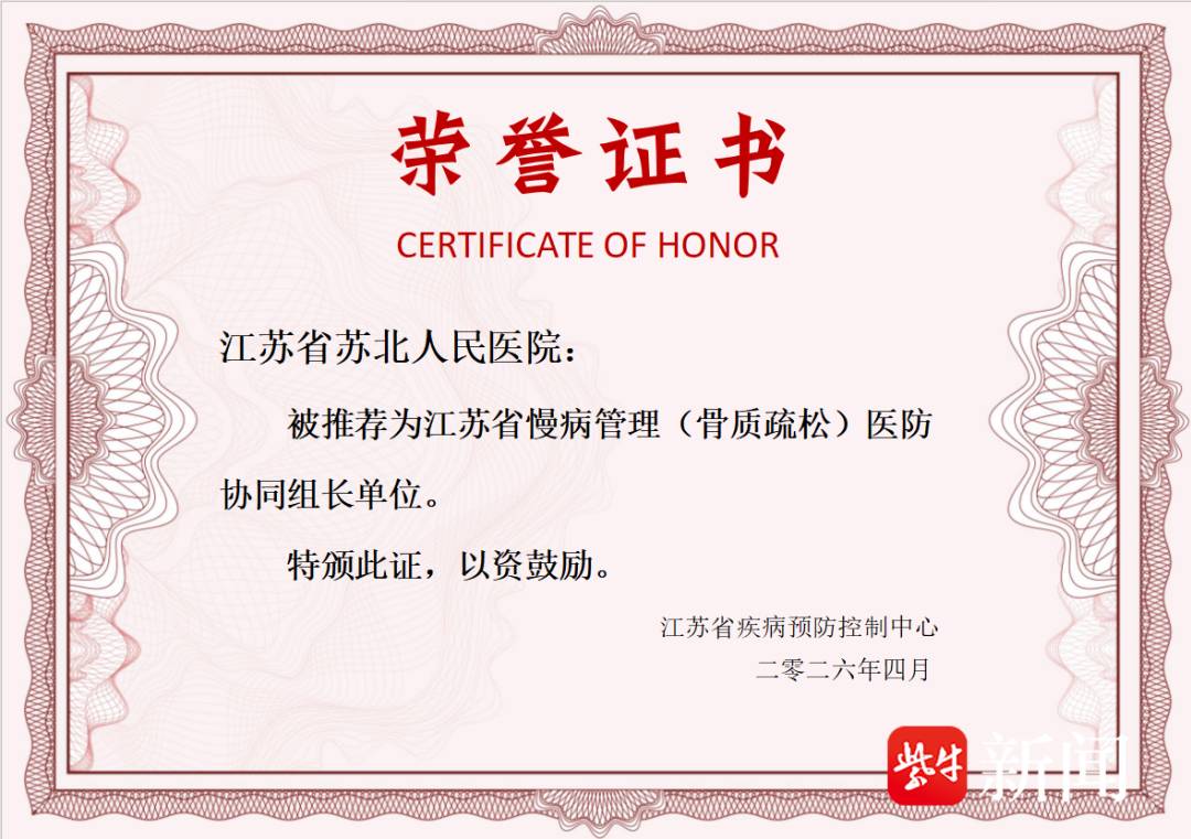 苏北人民医院被授予江苏省慢病管理(骨质疏松)医防协同组长单位