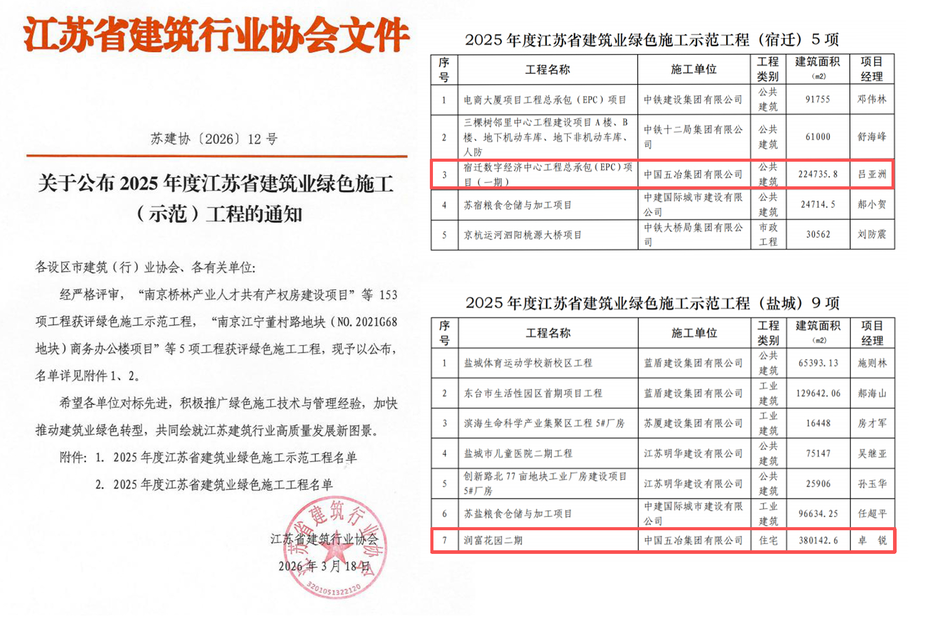近日,江苏省建筑行业协会公布2025年度江苏省建筑业绿色施工(示范)工程名单,由中国五冶集团承建的宿迁数字经济中心项目和盐城大丰安置房润富花园二期项目成功入选。