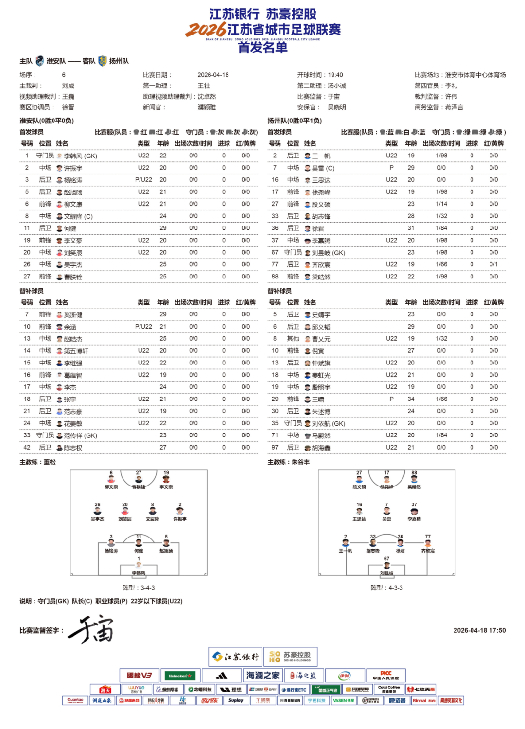 淮安vs扬州,首发名单出炉!