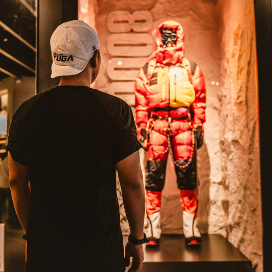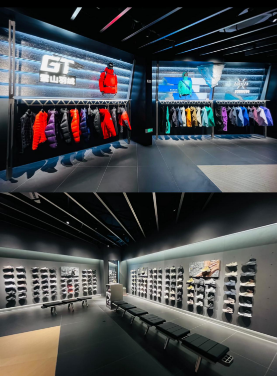 凯乐石“磐石空间”店内陈列着涵盖徒步、攀登、滑雪、越野跑等全系列专业装备,充分满足不同户外爱好者的需求。特别设置的8000GT高山连体羽绒服展示区和MONT系列硬壳冲锋衣专区,通过场景化的陈列方式,直观展示了产品在极端环境下的专业性能。