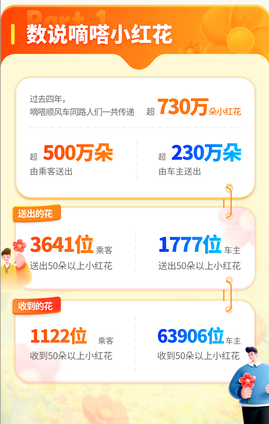 嘀嗒顺风同路人累计传递小红花超730万朵,在过去一年内新增超过230万朵。其中,乘客和车主分别送出超过500万朵和230万朵。其中送花收花最多乘客前三来自济南、深圳和南京。