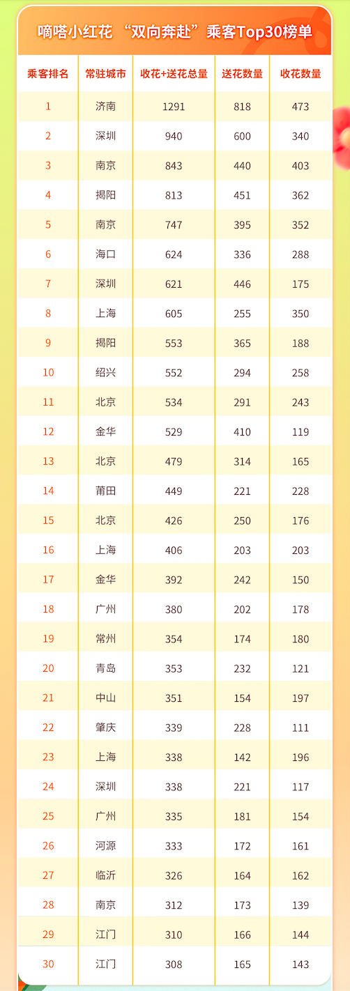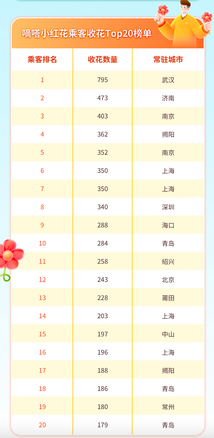 首次公布了6份榜单,还包括了嘀嗒小红花车主双向奔赴榜单和乘客双向奔赴榜单,车主收花Top20和乘客收花Top20榜单,以及车主和乘客各自的最爱送花城市Top20榜单。