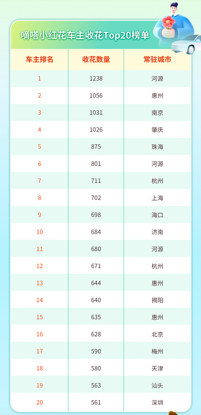 在收花Top20车主中,前五车主分别来自河源、惠州、南京、肇庆、珠海,收花数量依次为1238朵、1056朵、1031朵、1026朵和875朵。