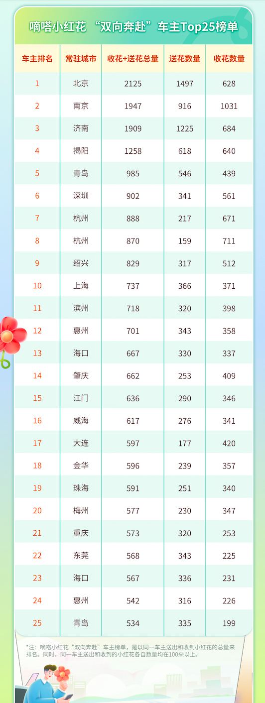 过去四年,有25位车主,送花数量和收花数量均分别超过了100朵,其中送花收花总量前五的车主,分别来自北京、南京、济南、揭阳和青岛这五个城市,他们各自送花收花总量依次为2125朵、1947朵、1909朵、1258朵和985朵。