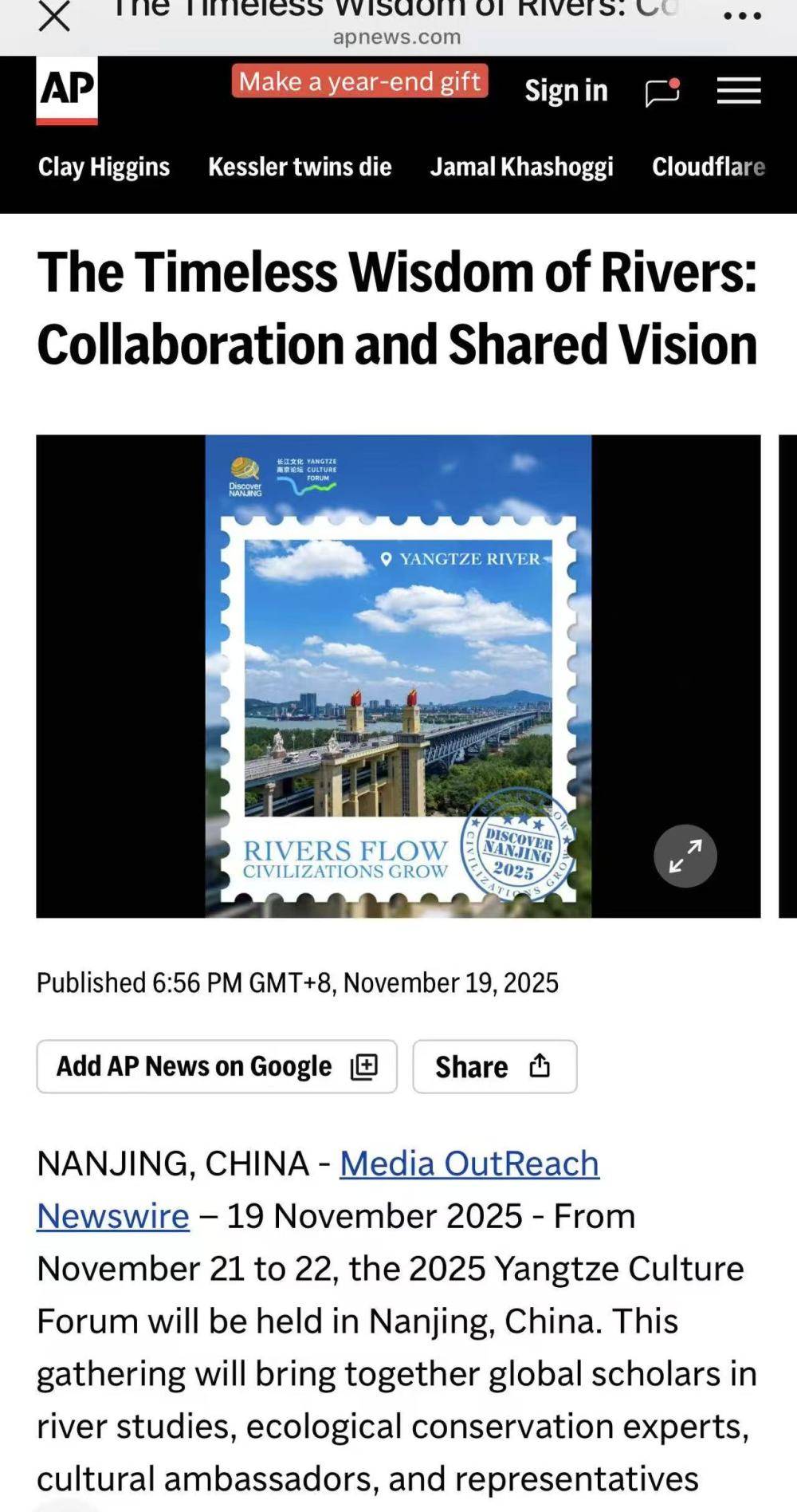 11月21日,2025长江文化南京论坛即将在扬子江畔启幕。11月19日,美联社网站发布题为《The Timeless Wisdom of Rivers: Collaboration and Shared Vision》(中译文《合作、共鸣的大河智慧源远流长》)主题文章,回顾南京与圣路易斯、纽约两座美国大河城市交流往事,也向全球读者展望2025长江文化南京论坛在推动水文化保护、水资源可持续利用、大河文明互鉴方面的积极作用,并对论坛配套的线上线下主题展览、互动活动进行介绍。