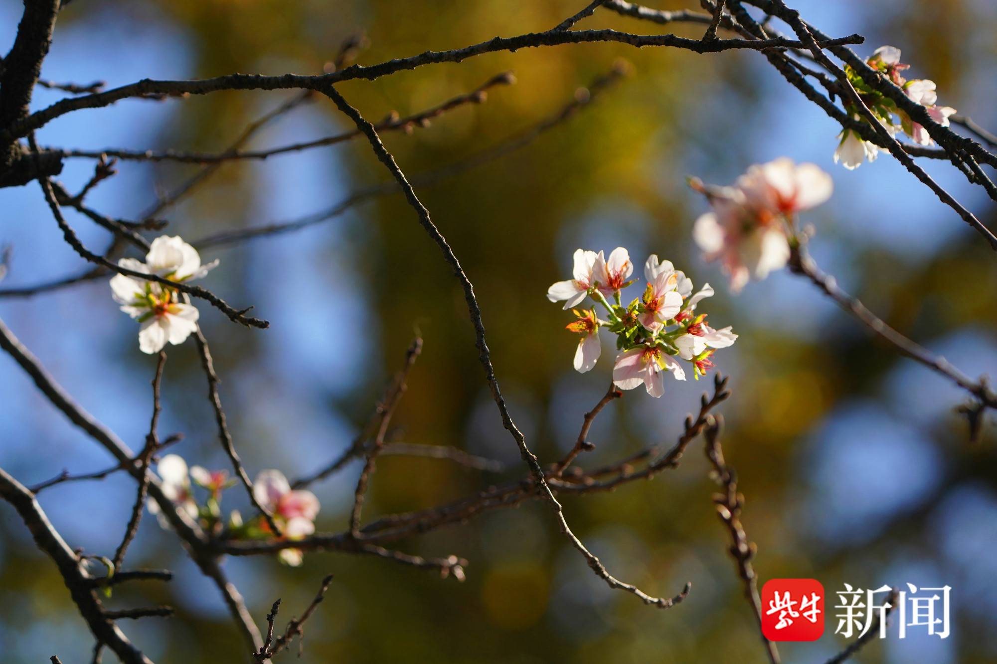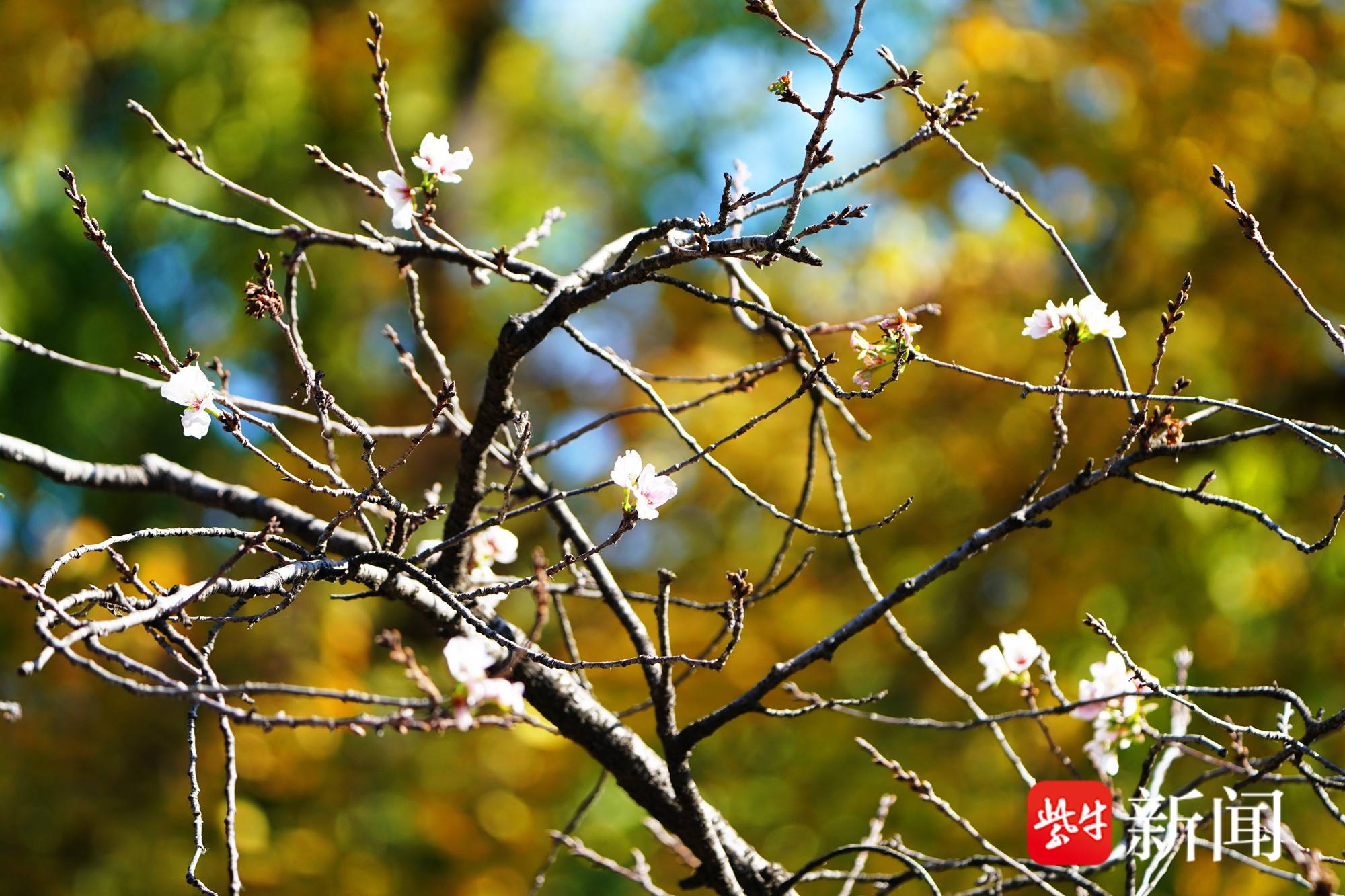 此时的南京,银杏树已进入金黄叶期,在冬季里花枯叶落,满路飘曳金黄叶,令人陶醉。令人意外的是,在南京鸡鸣寺大道上,一些樱花树却似乎“迷失了季节”,枝头绽放出粉白色的小花,既温婉可爱,又别有一番冬日的风情。