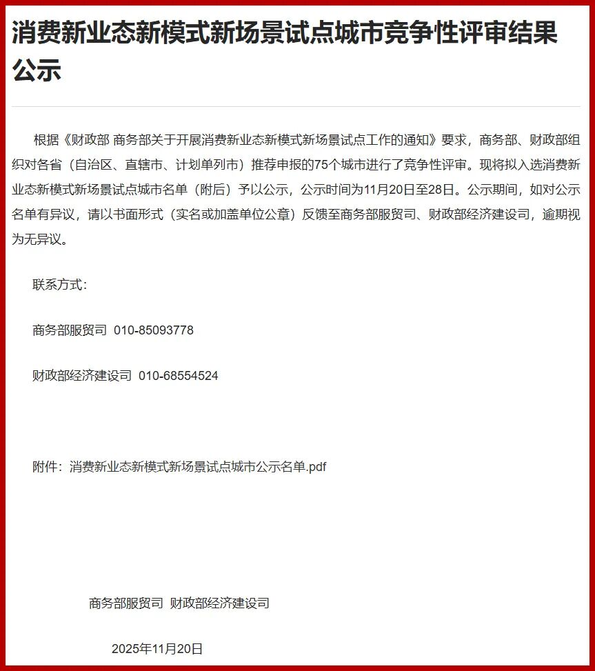 同日公示的消费新业态新模式新场景试点城市名单中,南京再度入选。该试点项目明确中央财政将对试点城市给予资金补助,通过消费新业态新模式新场景试点工作,支持试点城市增加优质消费供给,进一步释放多样化、差异化消费潜力,全方位扩大国内需求。