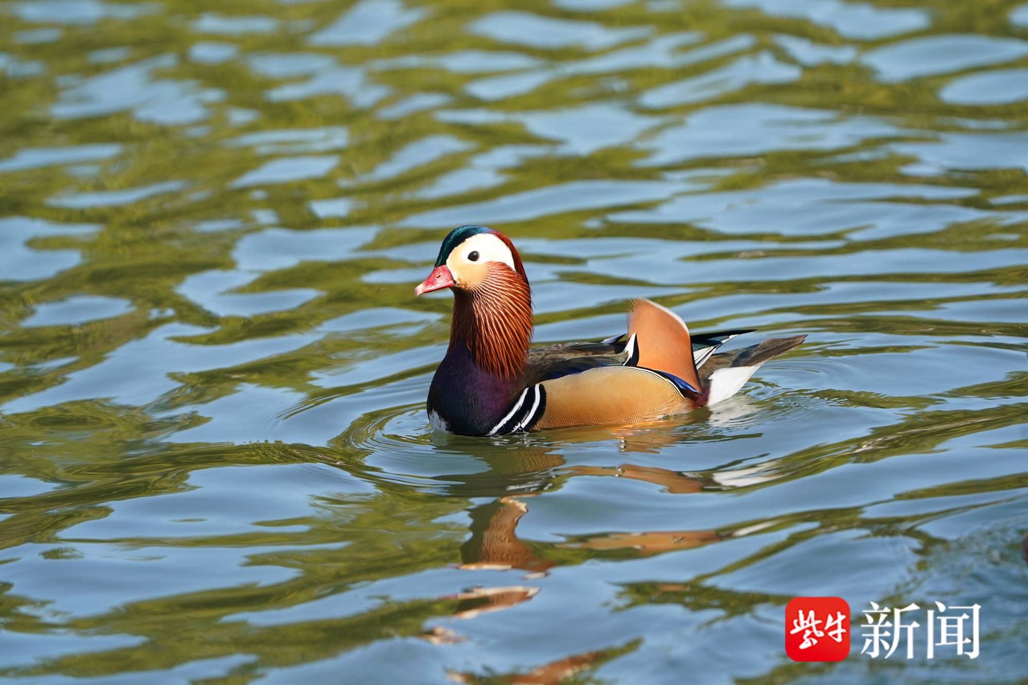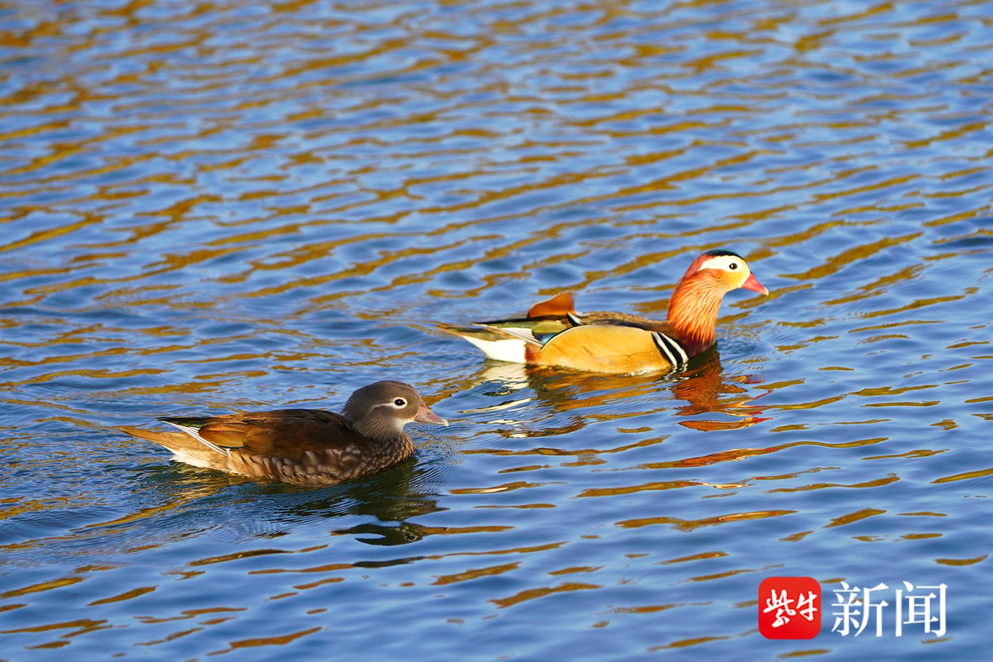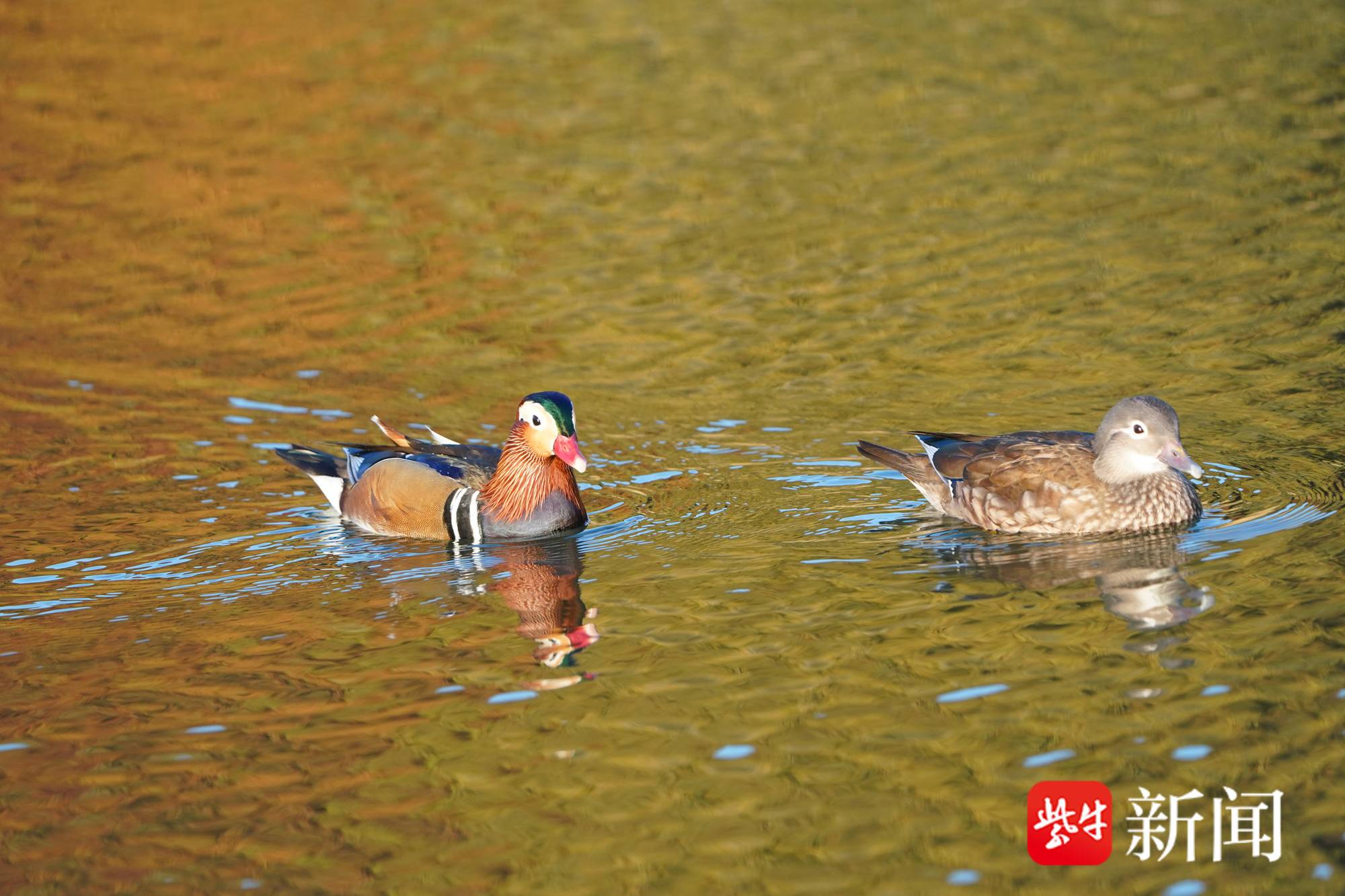 南京的中山植物园前湖因生态环境好,四面依山傍水,能吸引不少鸟类来此过冬。而这一对刚刚飞来不久的靓丽鸳鸯,在前湖中发出“爱、爱、爱”的鸣叫声,令人惊喜。一位观鸟的市民称,鸳鸯素有“爱情鸟”的美称,这也是今年中山植物园南园前湖中的第一批鸳鸯,因此格外引人关注。