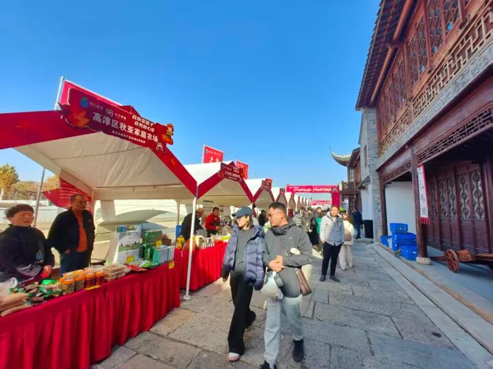 在层林尽染的栖霞山景区,惠农市集前人头攒动,各地游客纷至沓来。“这都是我们村的产品,小金桔刚摘的,快尝尝!”这边,江宁横溪新农人张静忙着跟来来往往的顾客推销产品;