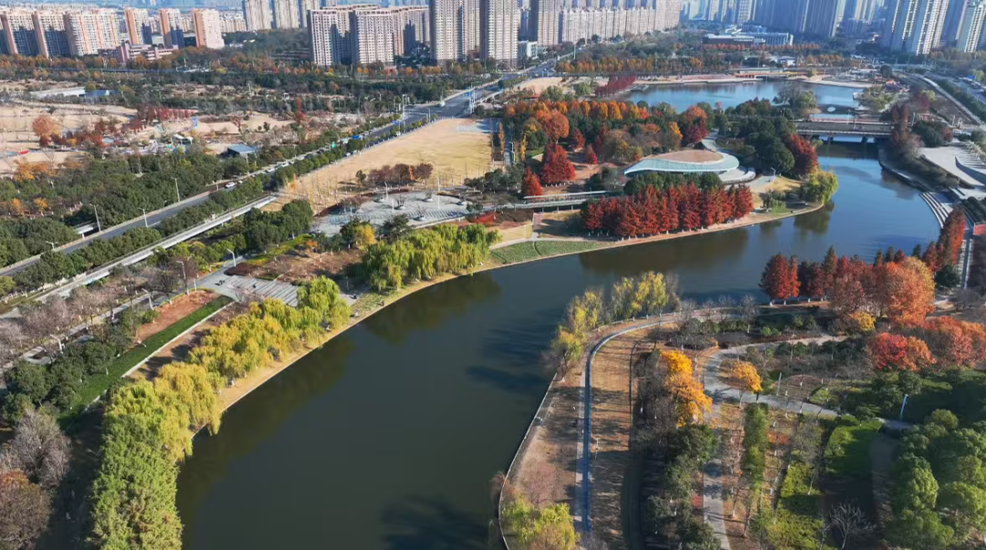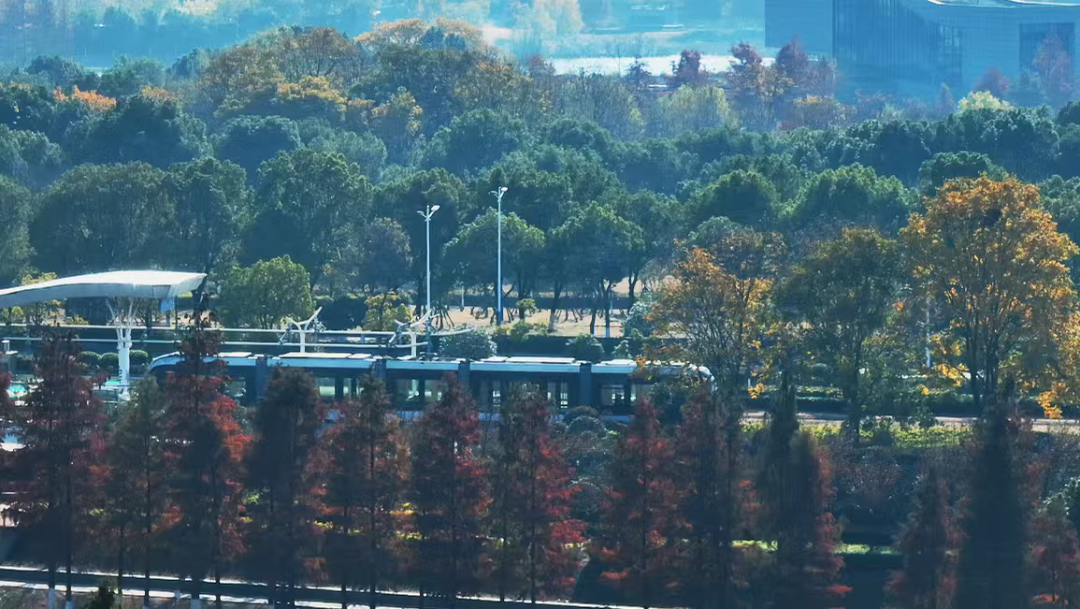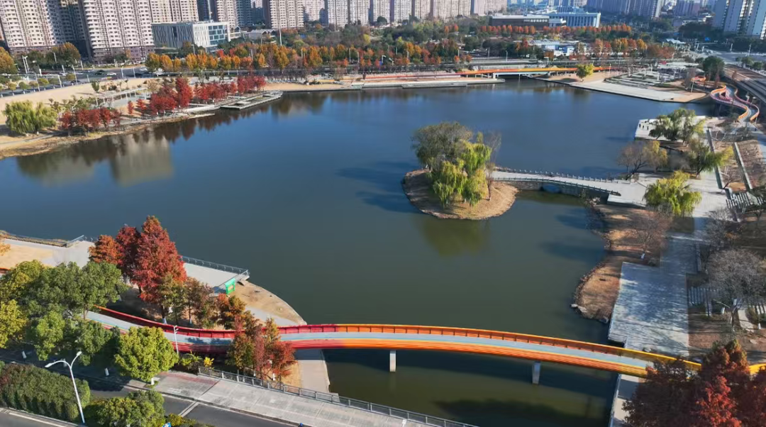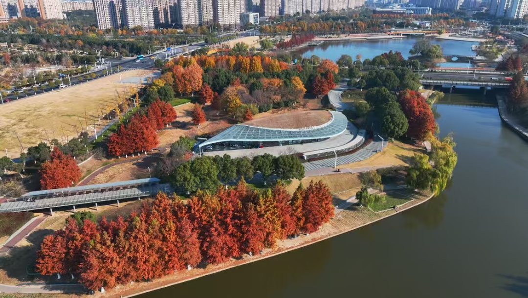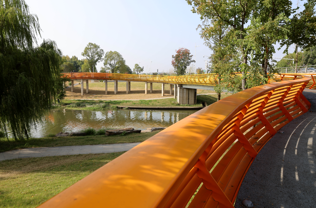 公园内蜿蜒的步行道、简洁的观景台,与秋色完美融合。你可能刚走过一座极具现代感的拱桥,转身便踏入一片红枫林,体现了麒麟科创园“在园区中建公园,在公园中建园区”的理念。