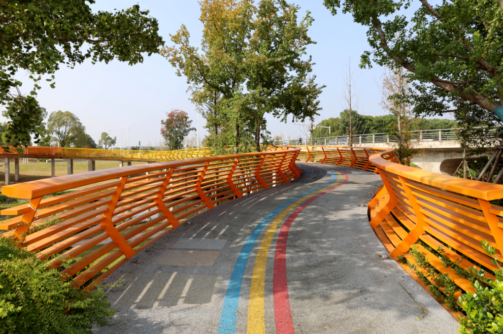 三河公园为立体设计,分上下两层。上层是栈桥,如高悬空中的彩虹般绕湖一圈;下层紧靠湖水,设有休闲座椅,能更好地欣赏粼粼波光。