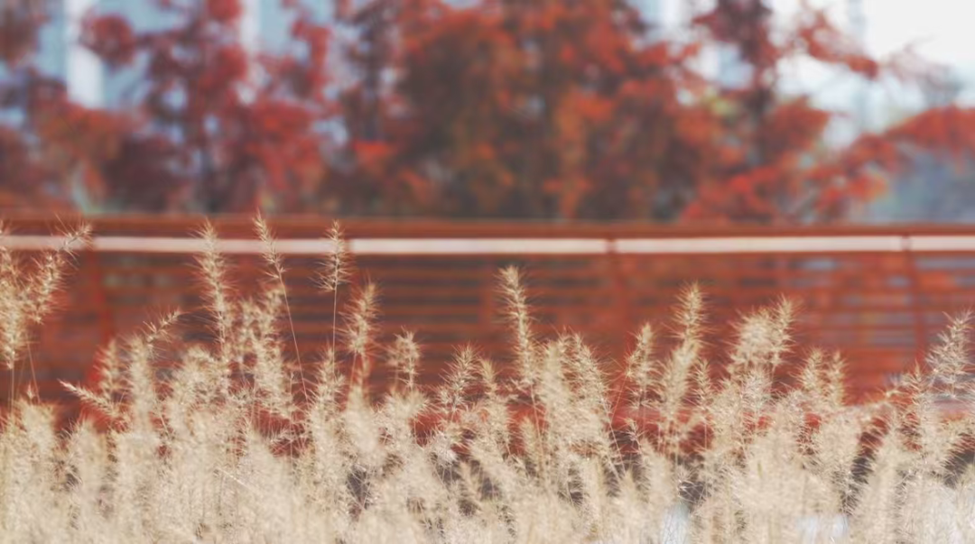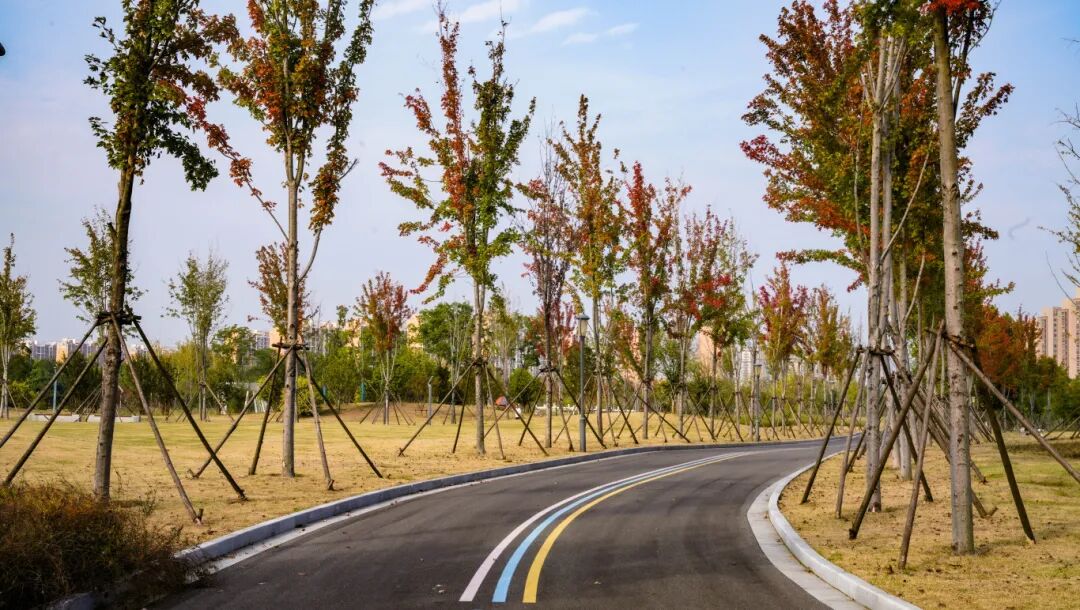 迈过燕西线,便是二期的开阔绿地。一条红枫步道蜿蜒其间,不论是漫步还是骑行都很合适。