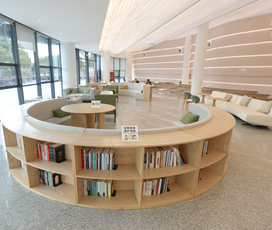 在麒麟生态公园中还有一处静谧的驿站,层层叠叠的白色顶灯在室内泛开涟漪,波浪形的书架、弧线阶梯座椅,仿佛将运粮河的柔波揽入怀中。从书架上随意取本书,尽享阅读时光。