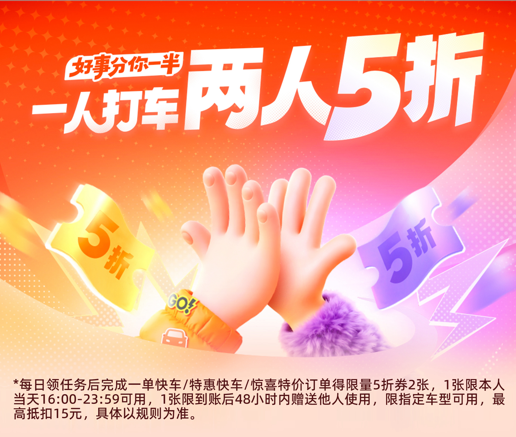 在活动城市的用户通过滴滴App或小程序进入打车页面,在目的地栏搜索“滴滴5折”进入活动会场。每天领取任务后完成一单快车、特惠快车或惊喜特价订单并完成支付后,可得到2张限量5折优惠券,单笔最高抵扣15元,乘坐指定车型可用。