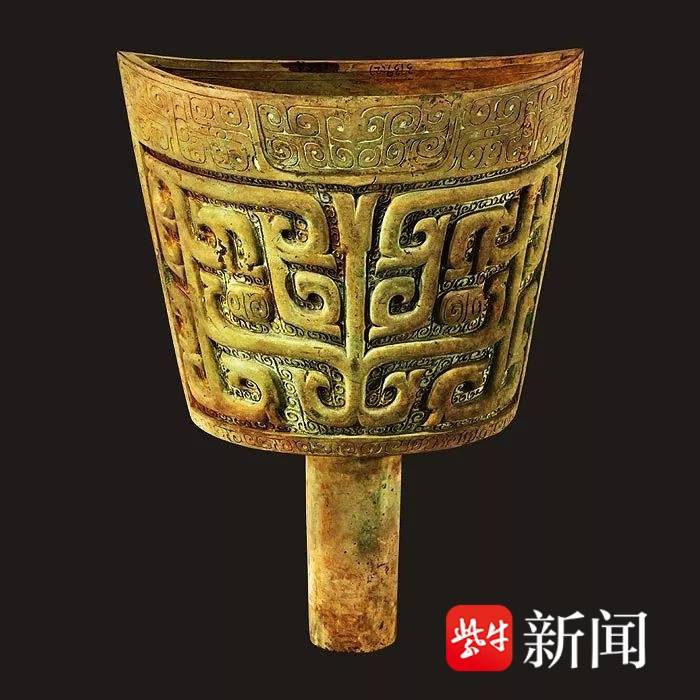 这件青铜器出土于浦口区永丰乡龙王荡,青铜铙两面钲部各饰兽面纹一组,并以云雷纹衬地。以粗陋的线条勾勒出兽面的轮廓,保持着以鼻梁为中心的对称排列形式,兽面双目圆睁,曲眉挺鼻,气势威严。隧鼓间又有规律地排列着三组云雷纹。整个器身部布满纹饰,布局严谨,线条粗疏流畅。