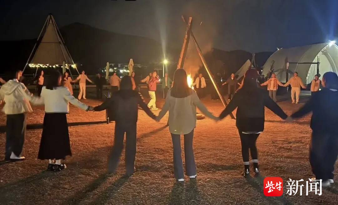 除了温馨的家庭游,年轻群体的乡村跨年需求同样旺盛。露营成为他们解锁乡村迎新的热门方式。位于佘村周边的青龙山7号营地,凭借丰富的户外项目,成为年轻游客的打卡热点。夜幕降临,营地内灯火璀璨,热闹的新年晚会如期上演,伴随着自助烧烤的香气,年轻人围炉畅谈、尽情欢歌,在山野间卸下一年的疲惫。