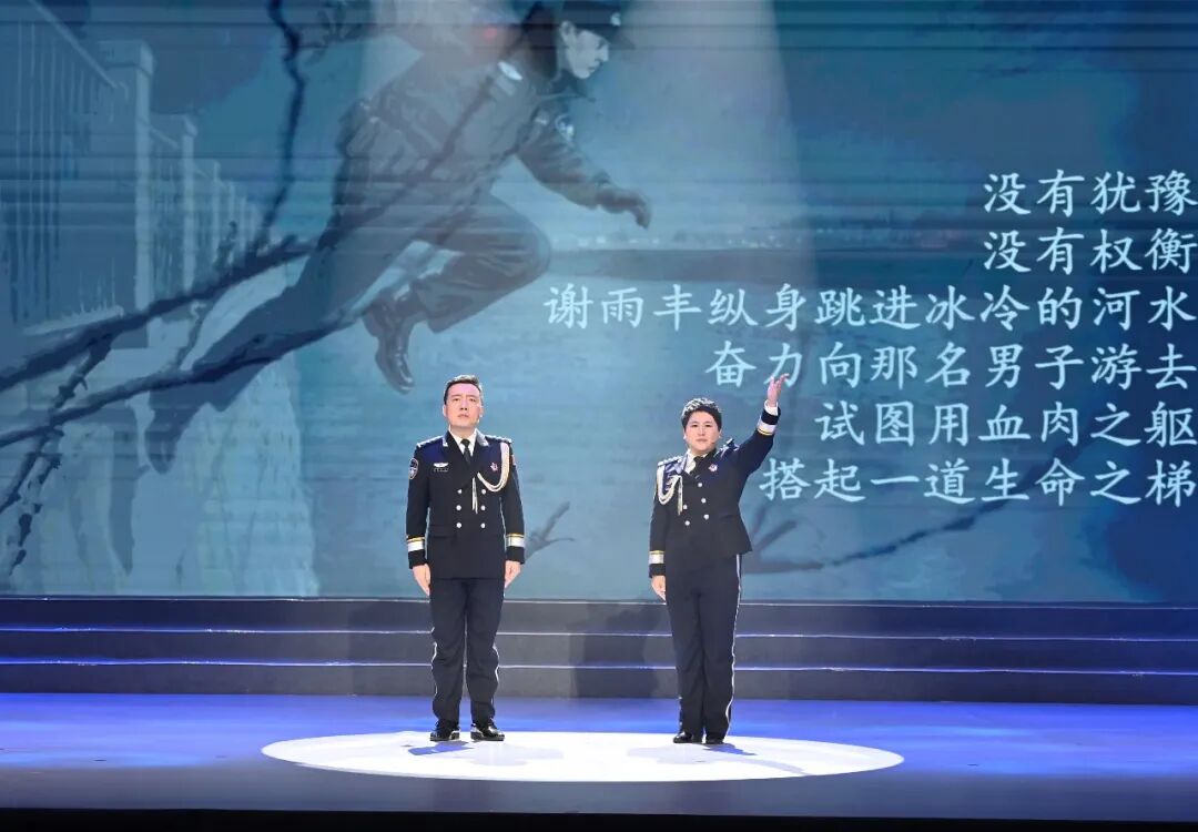 当抒情的旋律慢慢响起,“全国公安系统二级英模”、烈士谢雨丰的两名战友站在了舞台上,带来诗朗诵《忠诚的底色》。2025年1月20日凌晨,谢雨丰为救助落水群众,不幸壮烈牺牲,年仅24岁。
