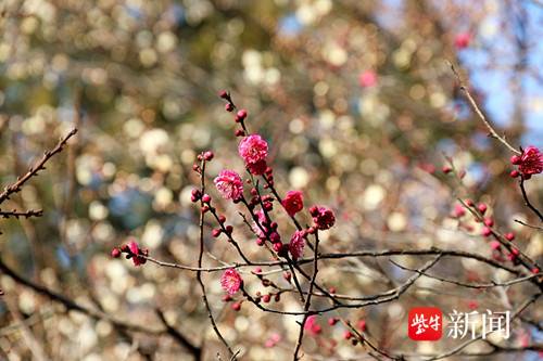 据了解,受晴暖天气持续加持,气温较常年同期偏高。南京梅花山的早梅品种“抢跑”迎春,较往年提前进入赏梅节奏。目前园内“单瓣早白”“红冬至”“粉红朱砂”等品种已零星绽放,预计1月下旬至2月初早花品种将逐步进入观赏期。