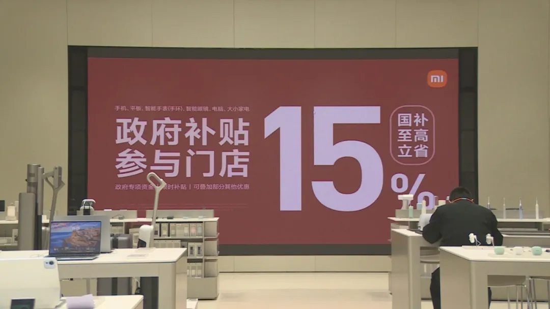 在江宁景枫中心的小米之家门店,不少消费者正在选购电子产品,店里随处可见“政府补贴15%”的宣传标语,家电、3C产品等迎来热销。