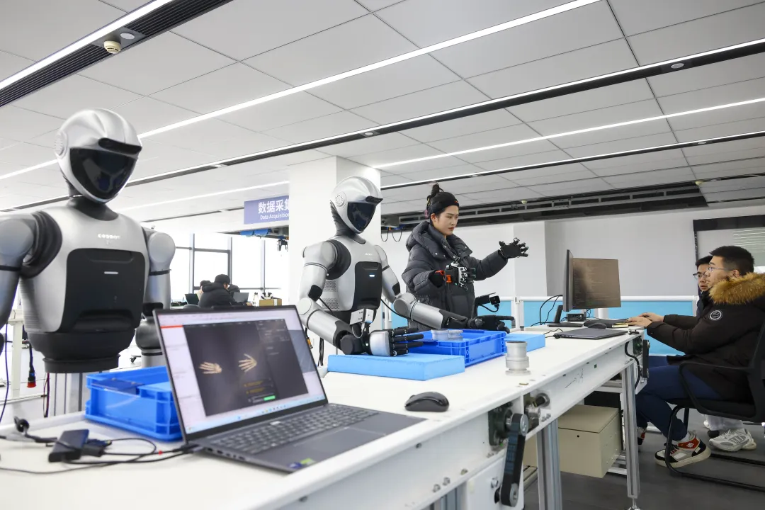 近日,在新建成的江苏鼎汇具身智能机器人创新中心内,科研人员正在对人形机器人进行数据采集。