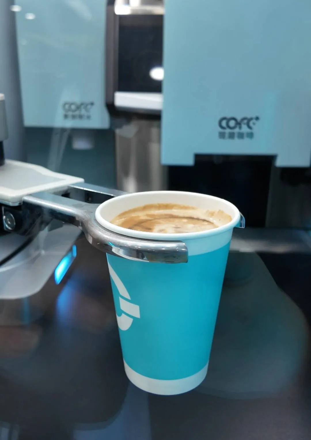 顾客在屏幕上选择咖啡并付款,机器手就能自动做出咖啡,还带有医院定制款拉花。