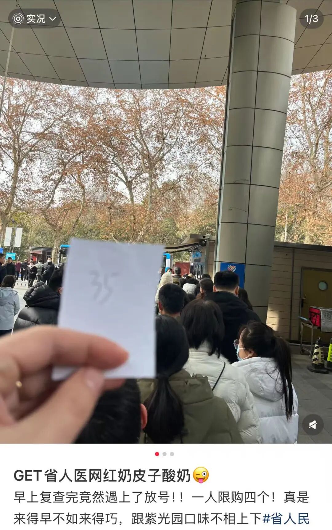 不过医院的酸奶非固定售卖,只有阿姨推着小推车才有,而且,一人限购三杯。