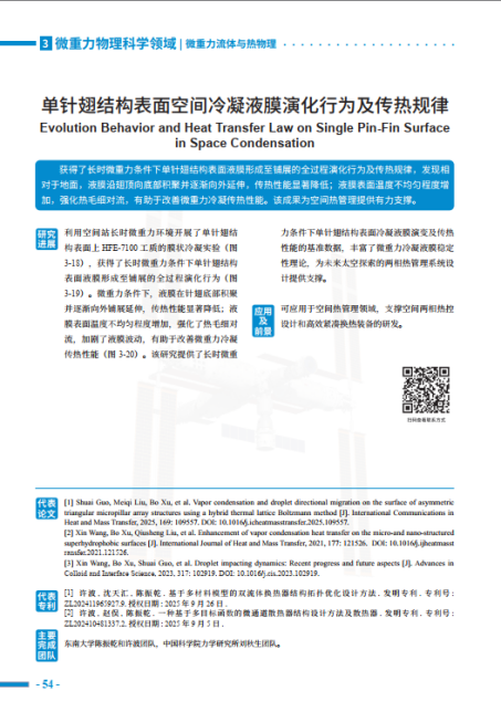该研究聚焦航天领域亟待突破的高效空间热管理关键科学与技术问题,利用空间站长时间稳定微重力环境,依托“梦天舱两相系统实验柜”,开展了单针翅结构表面上HFE-7100工质的膜状冷凝实验,获得了长时微重力环境下单针翅结构表面液膜形成至铺展的全过程演化行为及传热规律,发现了微重力环境下液膜在针翅底部积聚并逐渐向外铺展延伸,传热性能显著降低的现象,探索了液膜表面温度不均匀程度增加强化热毛细对流和液膜波动机制,丰富了微重力冷凝液膜稳定性理论,提出了高效的空间冷凝传热强化方法。