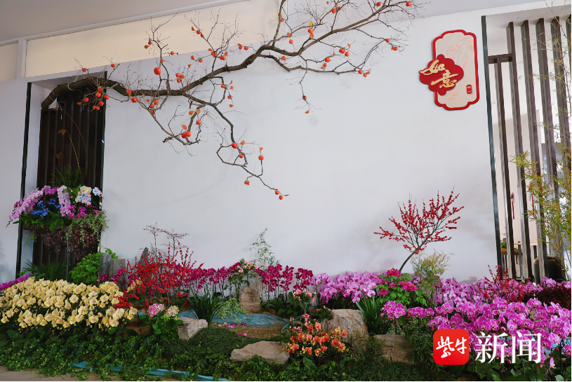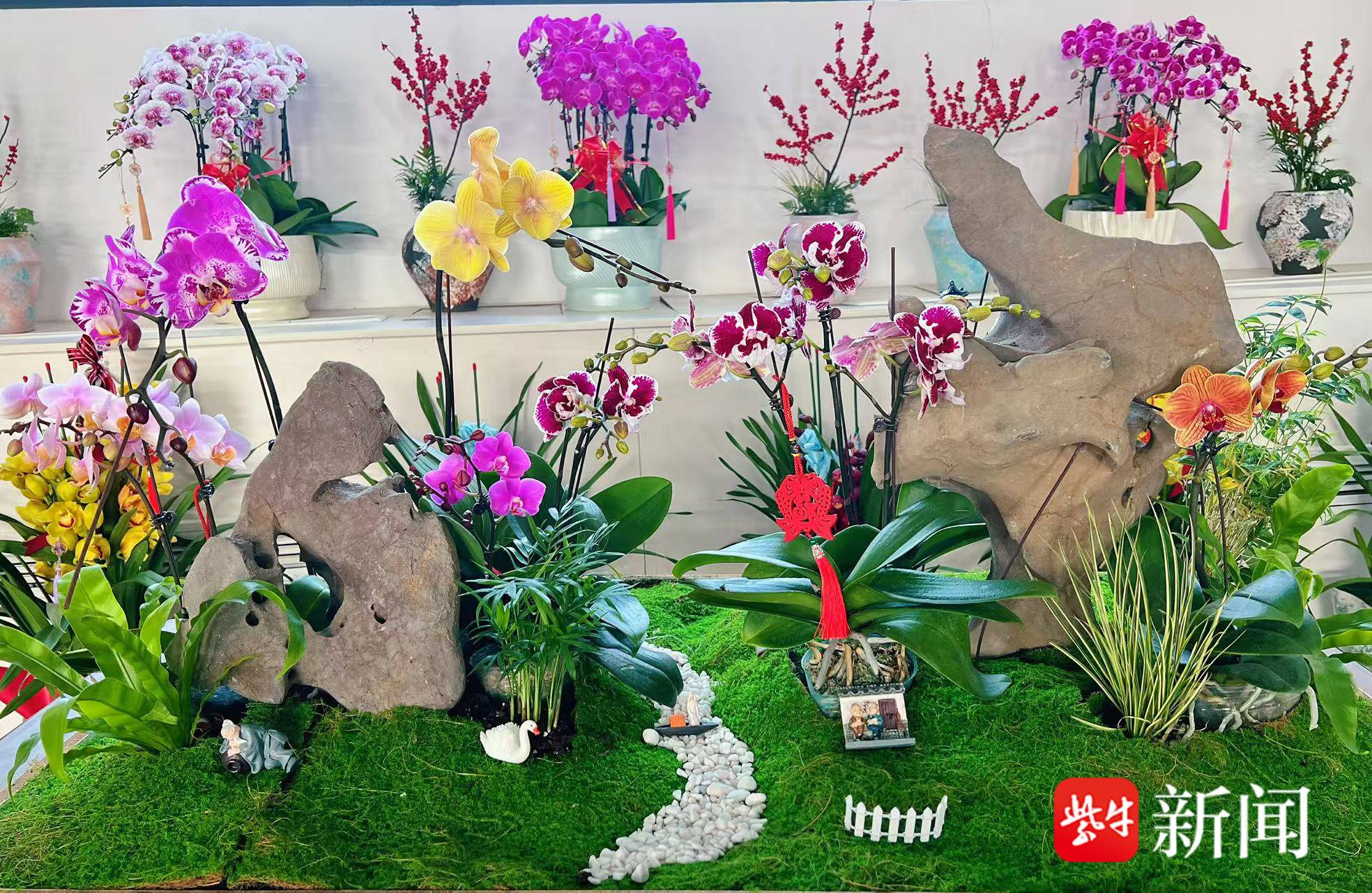 “今年的展区精心设置洋兰与国兰展示区,不仅有粉雾、大辣椒、马卡龙等最流行的蝴蝶兰品种集中亮相,还打造了兰花特色水溪小景。你看,柿子树枝条悬垂,树下汇聚了20多种不同品种的蝴蝶兰,搭配牡丹与绿植,潺潺流水增添灵动气息,寓意新年吉祥。”伊刘花卉市场工作人员王敏介绍,展区突破平面陈列,用鲜花构建出错落有致的立体景观,希望市民不仅能看花,更能融入景中,感受美好祝福。
