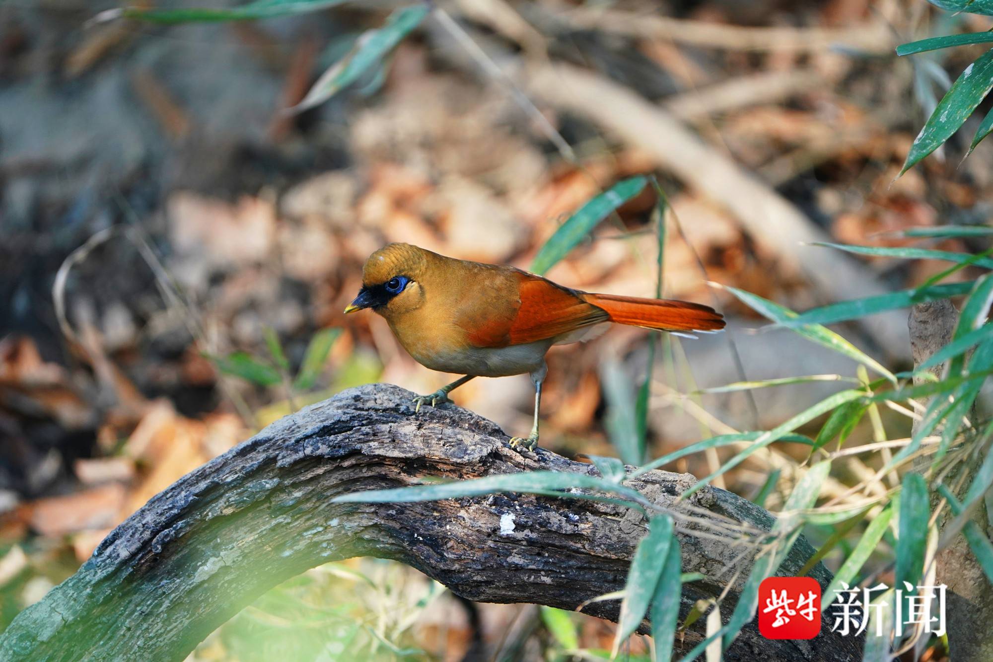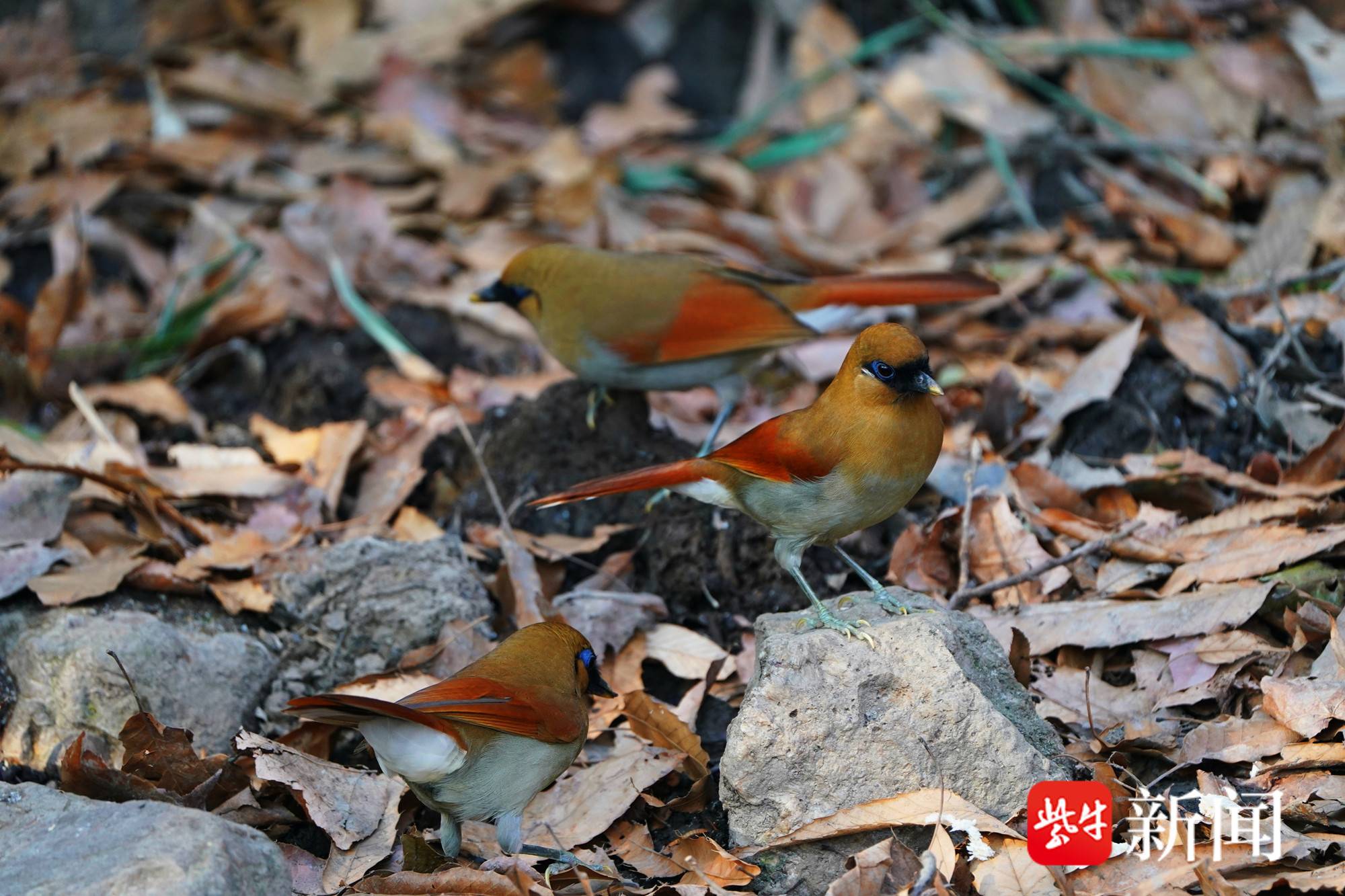 最特别的是,还有一群棕噪鹛鸟,属南京城中非常少见的鸟类。这群鸟有拳头大小,羽毛鲜艳。其上体赭褐色,头顶具黑色羽缘,尾上覆羽灰白色,尾羽棕栗色,外侧尾羽具宽阔的白色端斑。额、眼先、眼周、耳羽上部、脸前部和颏黑色,眼周裸皮蓝色,极为醒目。