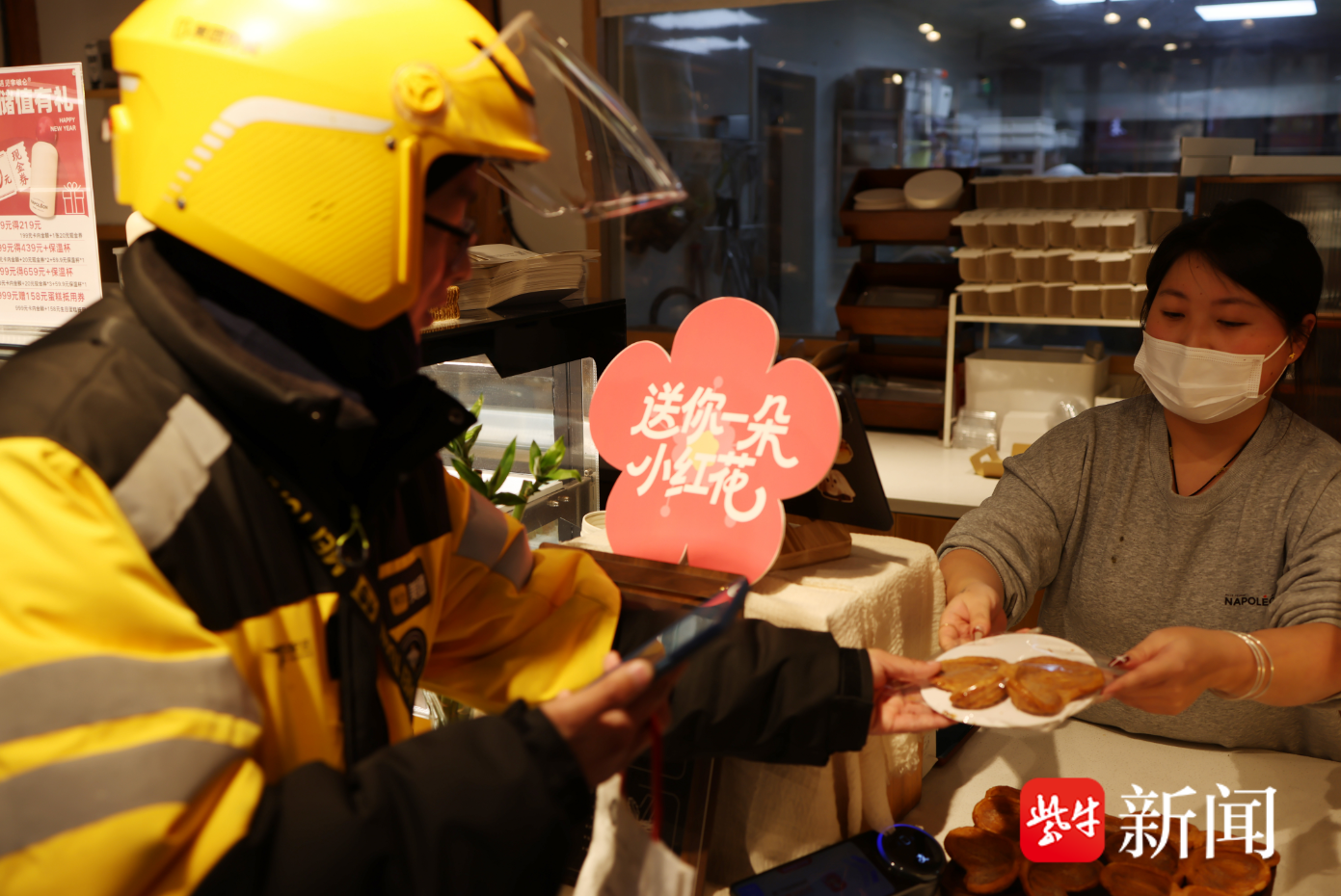 更温暖人心的是,一份份心意正被送至快递员、外卖员等户外工作者手中——拿破仑、八号黄油、鸿梧小院、非遗传习馆等商户,将糕点、文创与热饮等“温暖礼包”赠予出去;与此同时,街区工作人员为部分商户张贴马年主题窗花,让古街在年味中透着春的生机。