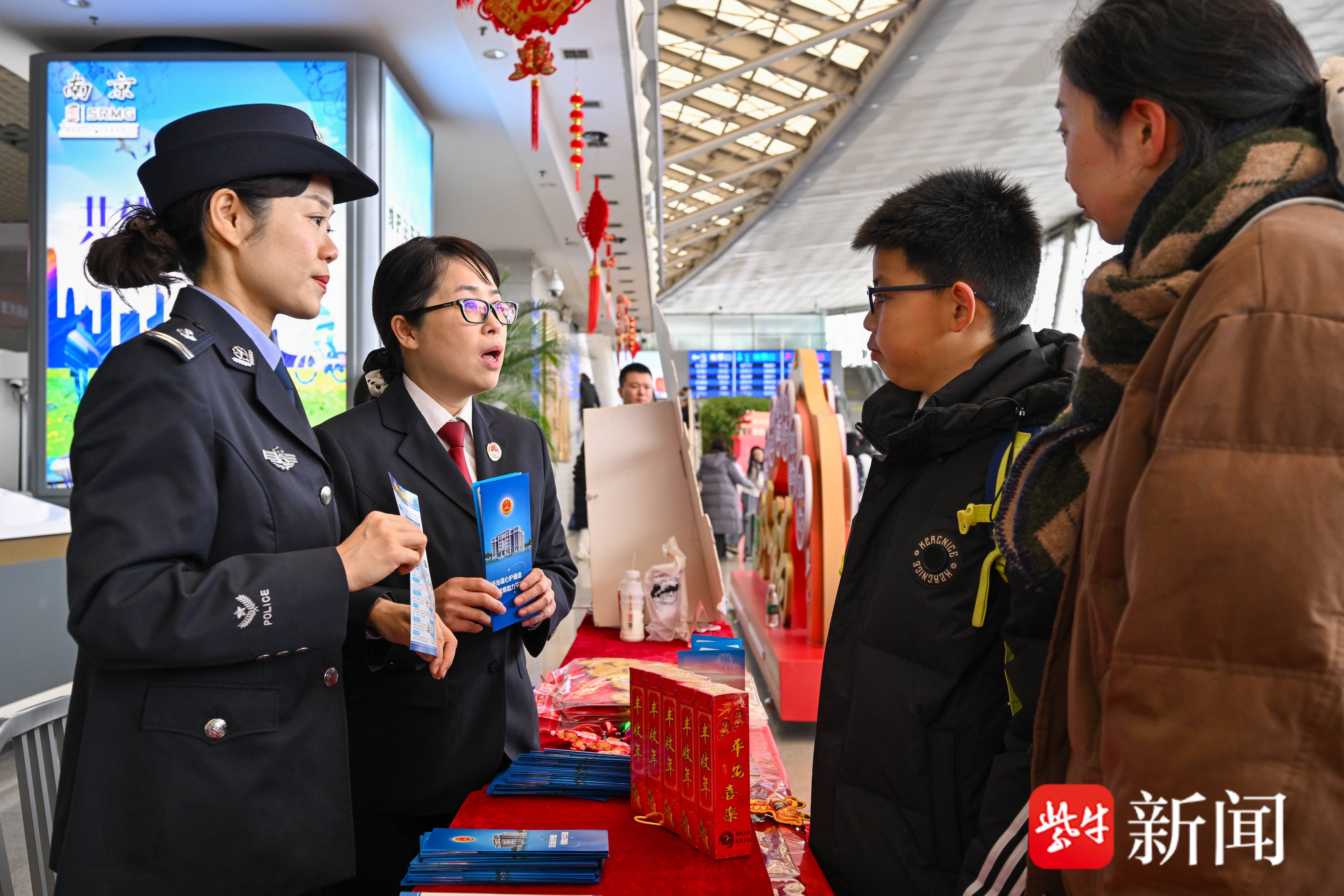 2月9日,南京铁路公安处联合江苏博事达律师事务所、铁路检察院等多家单位,在南京站南候车大厅共同开展“平安春运 法治同行”为主题宣传活动。通过危险品展示、见义勇为倡导、普法咨询、反诈科普等形式,为南来北往的旅客送上“平安礼包”。