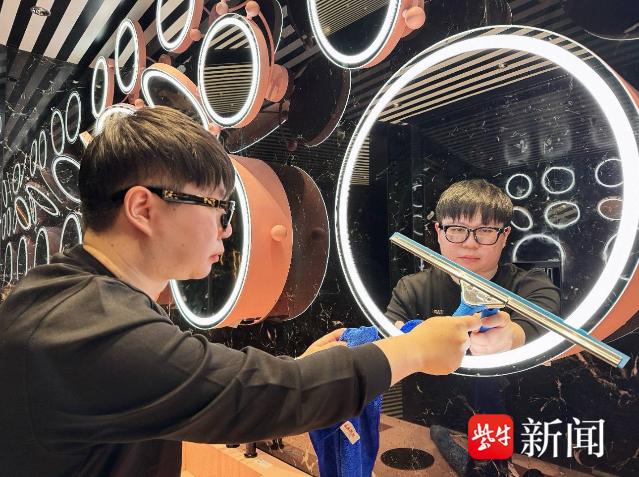 网红镜面需要高频擦拭,确保无水渍。扬子晚报/紫牛新闻记者 范晓林 摄