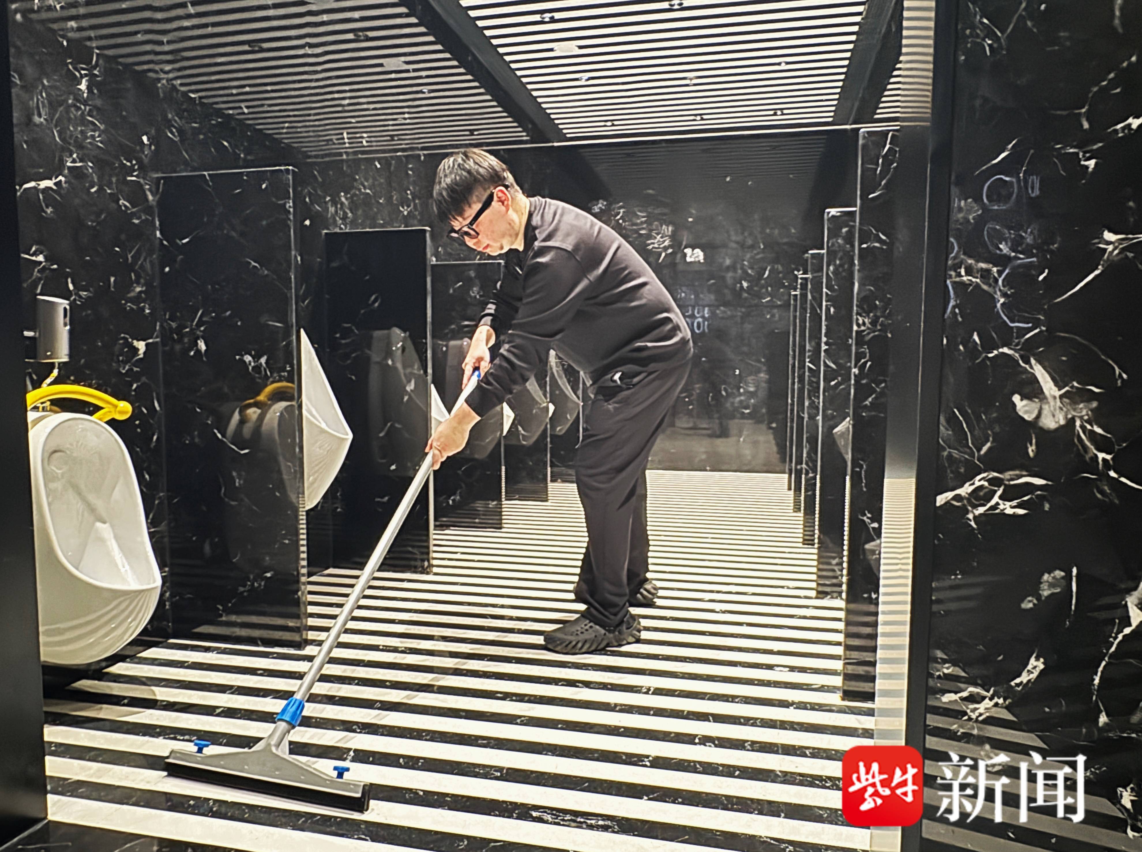 大约3小时的“见习”,记者擦拭了两遍洗手台、一排艺术梳妆镜、数个坐便器,用拖把拖了多处小便池周围的地面。频繁弯腰、屏息发力,记者腰部有点发酸,手指也因抓握刮水器而略有些僵硬。“这只是保洁员日常工作中最轻量的部分。”朱和军说。