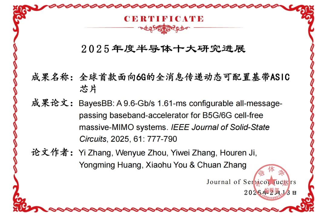 就在两会为6G未来产业发展锚定方向的关键节点,东南大学信息科学与工程学院张川教授、尤肖虎院士团队正式收到2025年度“半导体十大研究进展”获奖证书,其联合紫金山实验室研发的全球首款面向6G的全消息传递动态可配置基带ASIC芯片(BayesBB)凭借在6G核心硬件领域的突破性创新斩获该项荣誉。