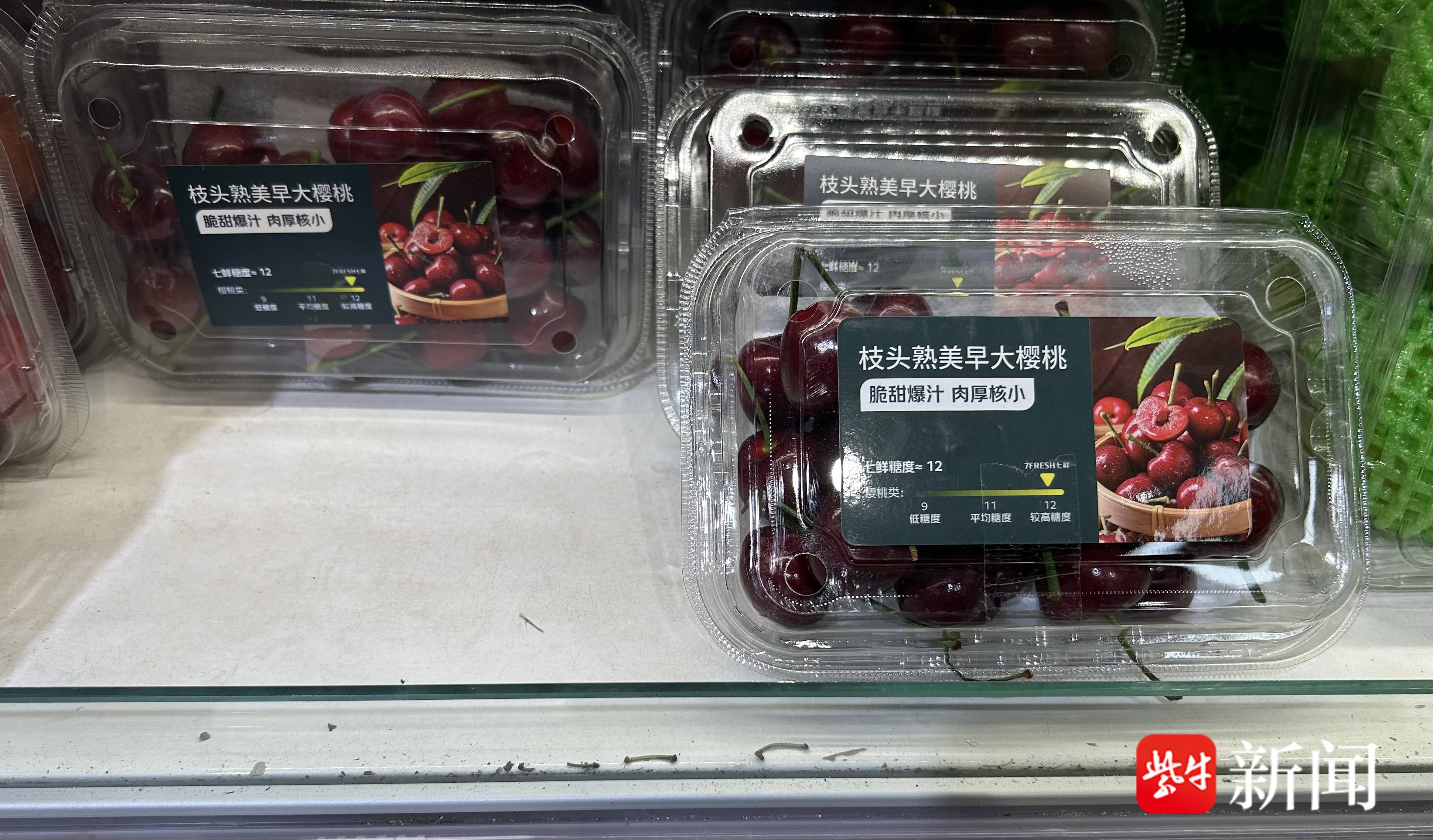 在盒马鲜生,大连美早樱桃也不便宜。4J规格的大连美早樱桃售价49.9元一盒(250g),约合99.8元一斤。3J规格礼盒装(1kg)售价139元,相当于69.5元一斤。果径在J到2J之间的小果,也要59.8元一斤。