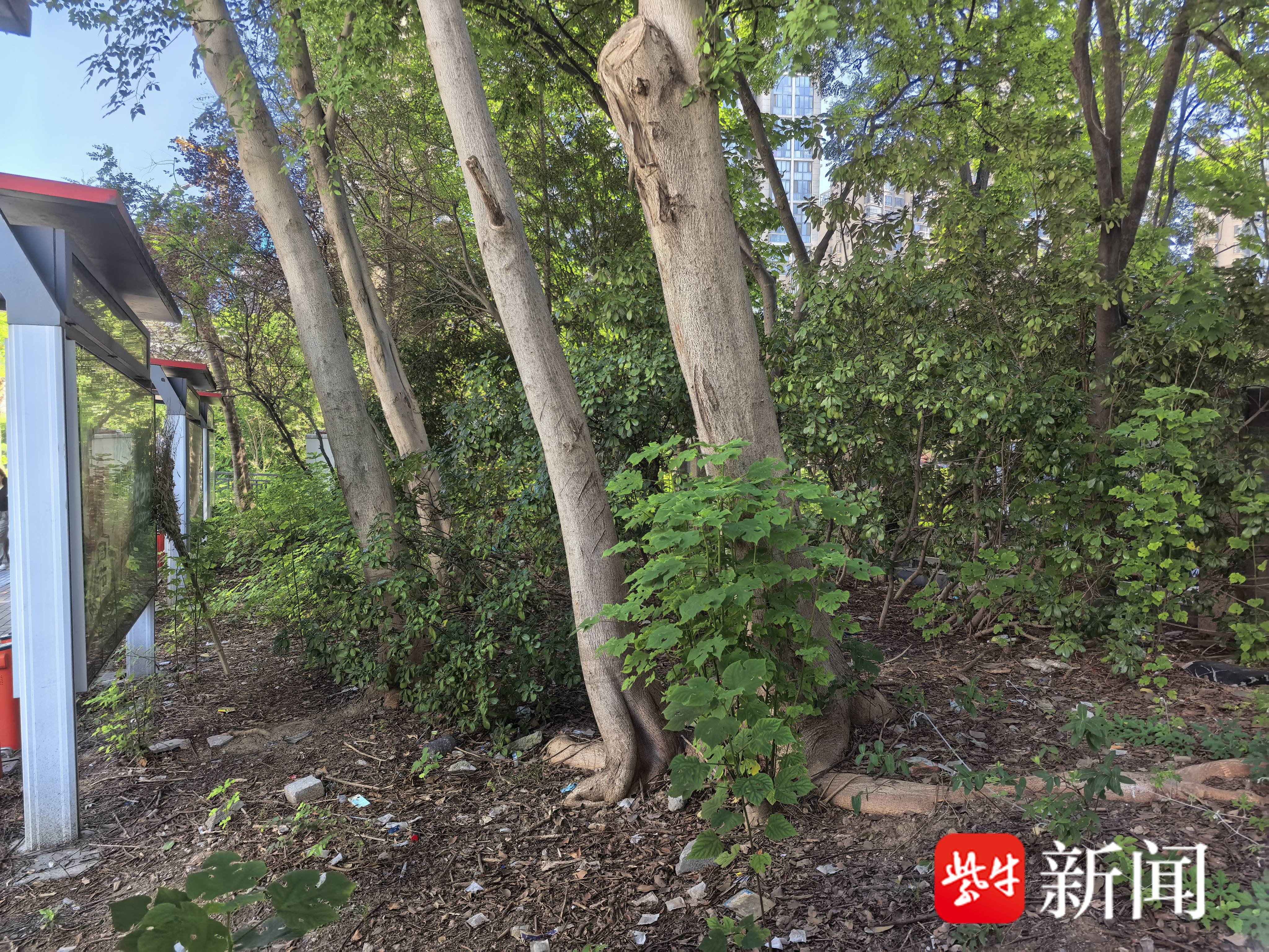 位于江东北路212号的这块“边角料”地块虽然紧临小区出入口,但由于处于小区红线外,曾是缺乏管养的卫生死角。不仅如此,杂树的枯枝还垂挂到江东北路慢车道,常打到骑车人并引发投诉。凤凰街道城治办杨勇告诉记者,为了彻底改善区域环境,街道决定对该地块进行绿化景观提升,并以凤凰花园城社区党建品牌 “凤凰花开” 进行命名。