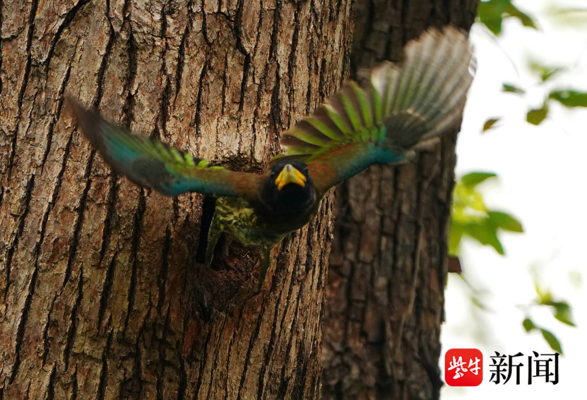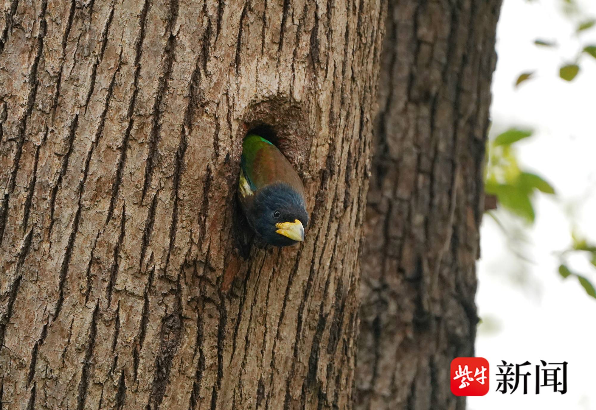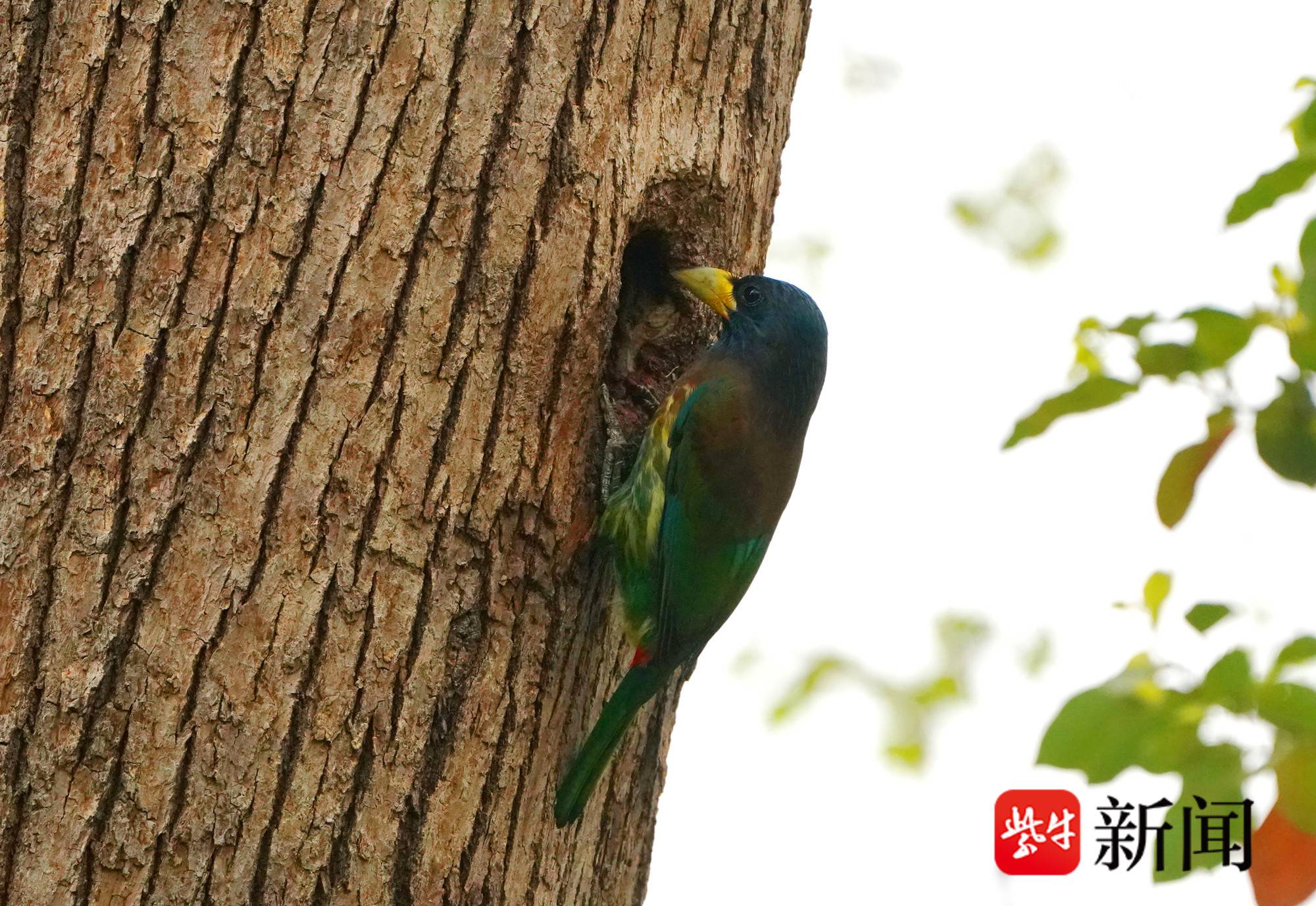 罕见!南方热带大拟啄木鸟,飞来南京辛苦育雏