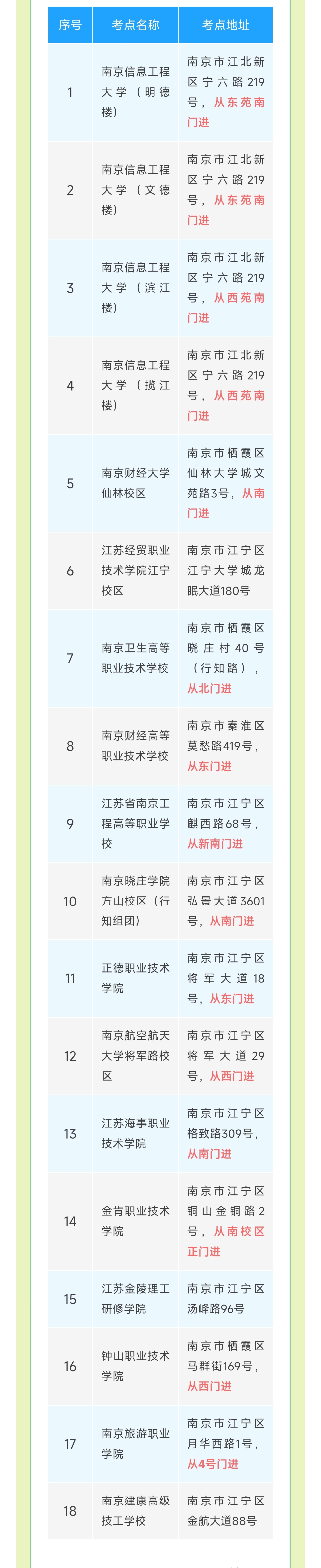 本次考试南京考区共设18个考点,前往考点时,请仔细核对考点名称、地址,特别注意进入考点大门方位。请考生提前熟悉考点周边环境,合理规划最优赴考路线,预留足够的入场核验等待时间,以防因天气变化、交通拥堵等情况耽误考试。