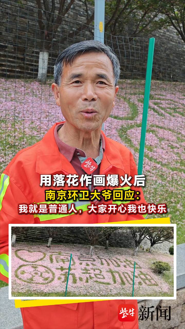 南京环卫大爷用落花作画爆火后回应:我就是普通人,大家开心我也快乐
