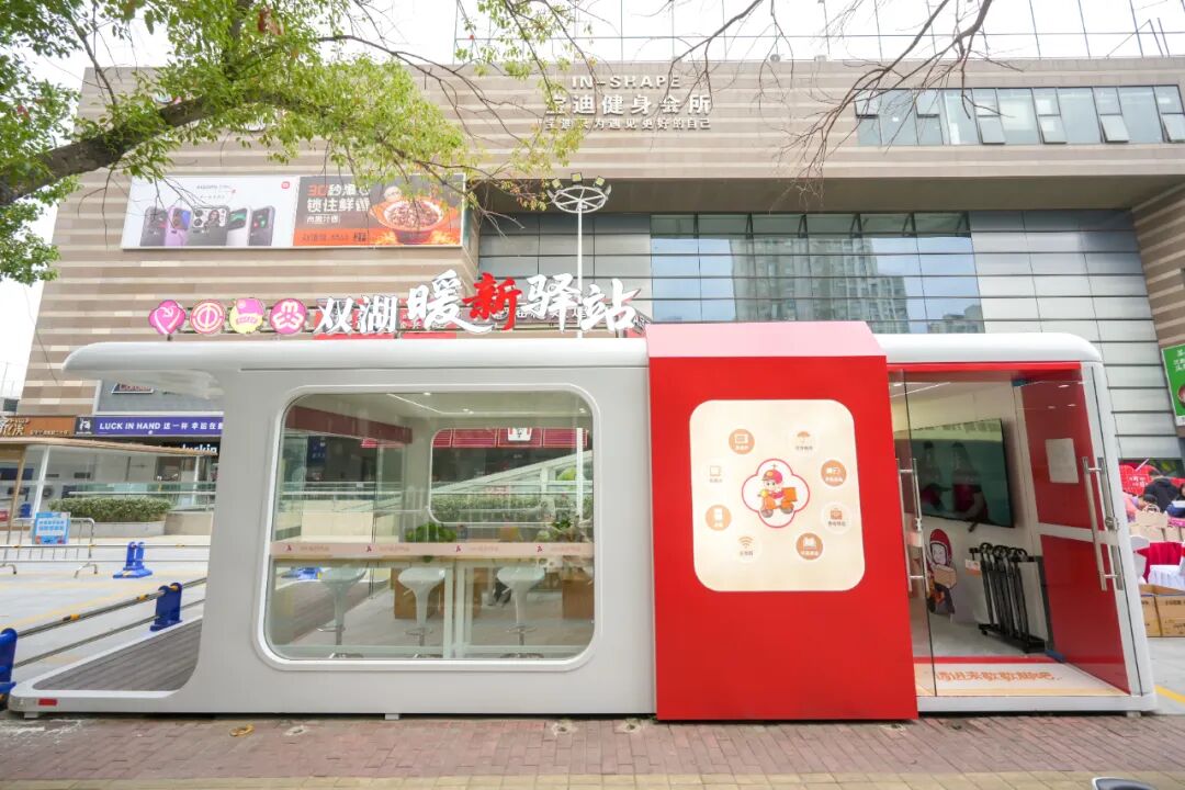 在苏州工业园区,双湖广场暖“新”驿站,配备饮水机、充电设备、医药箱、雨伞、书架及舒适座椅等服务设施,充分满足骑手们休息、补给的基本需求。