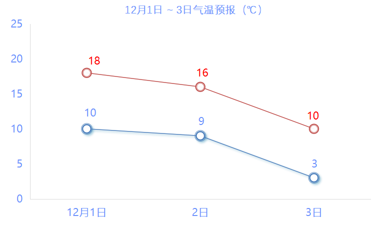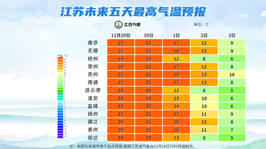 11月29日、30日两天升温之后,12月1日后期有一次较强冷空气过程,全省自北向南开启气温速降模式,影响后全省最低气温48小时过程降幅:淮河以南地区9℃~11℃,其他地区6℃~8℃。