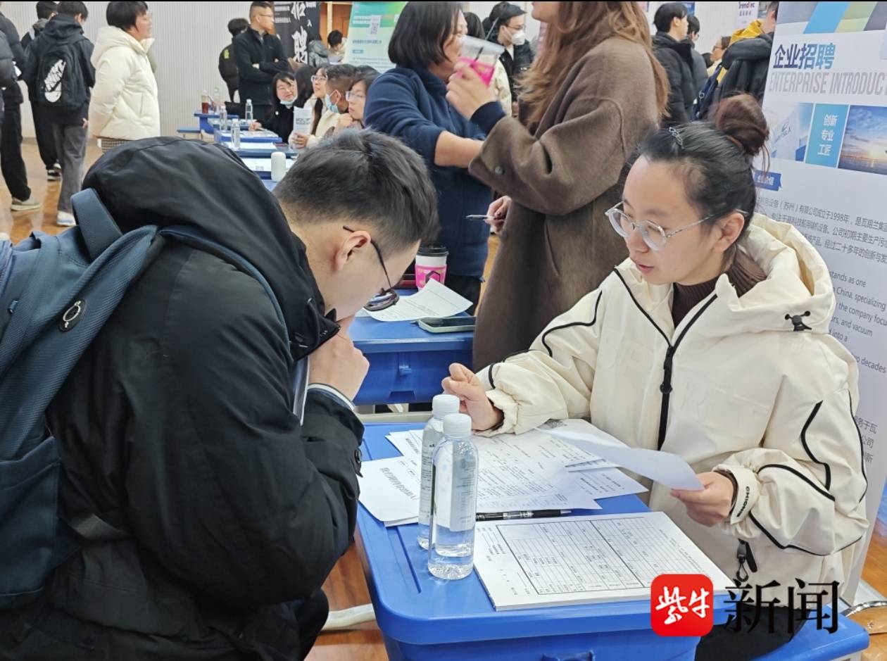 扬子晚报/紫牛新闻记者在现场看到,双选会现场人气爆棚,企业摊位前挤满咨询、应聘的学生,火热氛围持续升温。据统计,本场招聘会汇聚96家品牌企业,提供千余个优质岗位,覆盖电子信息、装备制造、金融电商等多个领域,岗位数量较2024年增长20%,专业覆盖率达100%。招聘会最终实现500余份意向达成,316名学子当场签订就业或实习协议。