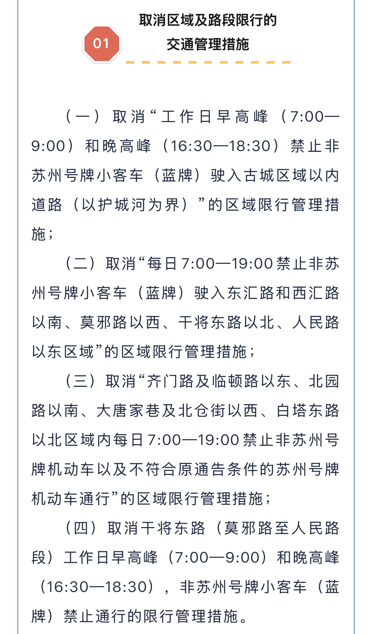 记者从通告中获悉,此次取消的限行措施覆盖古城核心区域及重点路段,包括护城河以内区域的工作日高峰限行、东汇路周边的日间限行、齐门路至临顿路片区的通行限制,以及干将东路重点路段的高峰限行。