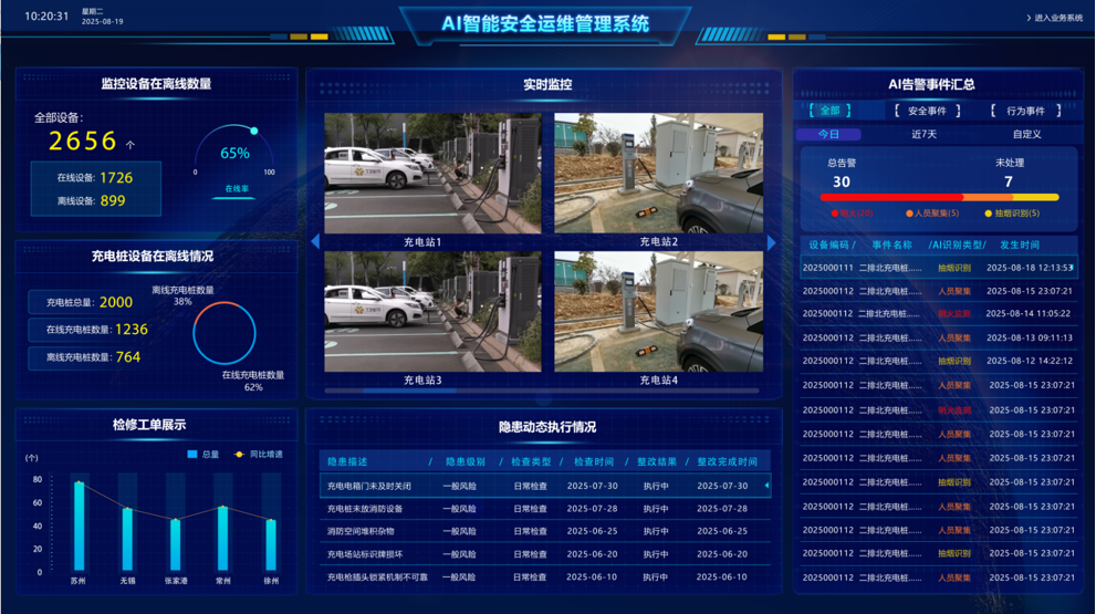 在技术创新方面,项目采用“集中整流+柔性母线+动态功率分配”架构,通过“车—桩—云—边”协同模式,结合AI算法实现功率调度与排队预测,优化资源配置效率。同步搭建的AI智能运维系统,以视觉算法+规则引擎为核心,可全天候识别明火、设备异动、人员聚集、油车占位等安全风险,通过“运维驾驶舱”集中管控与APP/短信秒级告警,构建“预警—处置—复盘”的全流程闭环管理,推动站级安全体系从“人防为主”向“技防优先”转型。