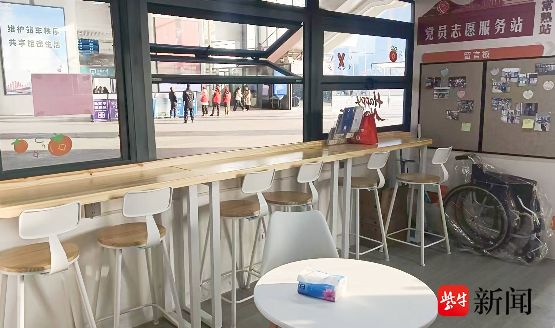 驿站设在常熟站出站口,位置便捷、触手可及。起初配备1名专职志愿者,经过多方协调,如今日常已有2-3名志愿者在岗值守,用微笑和耐心,接待每一位过往旅客。