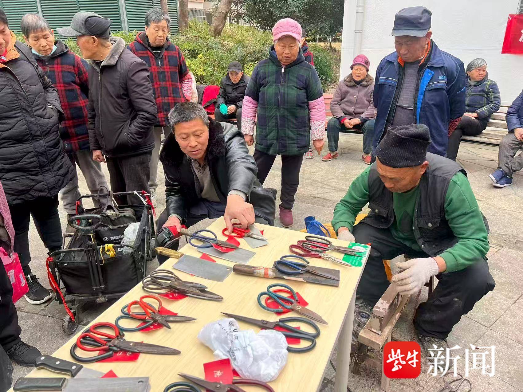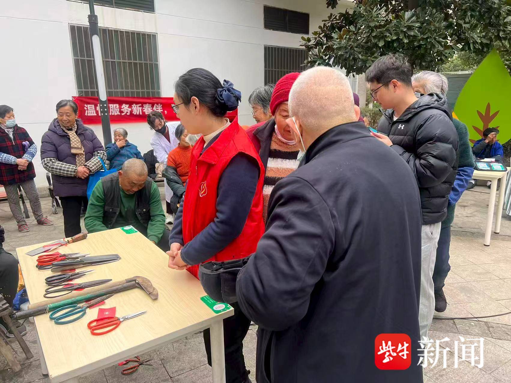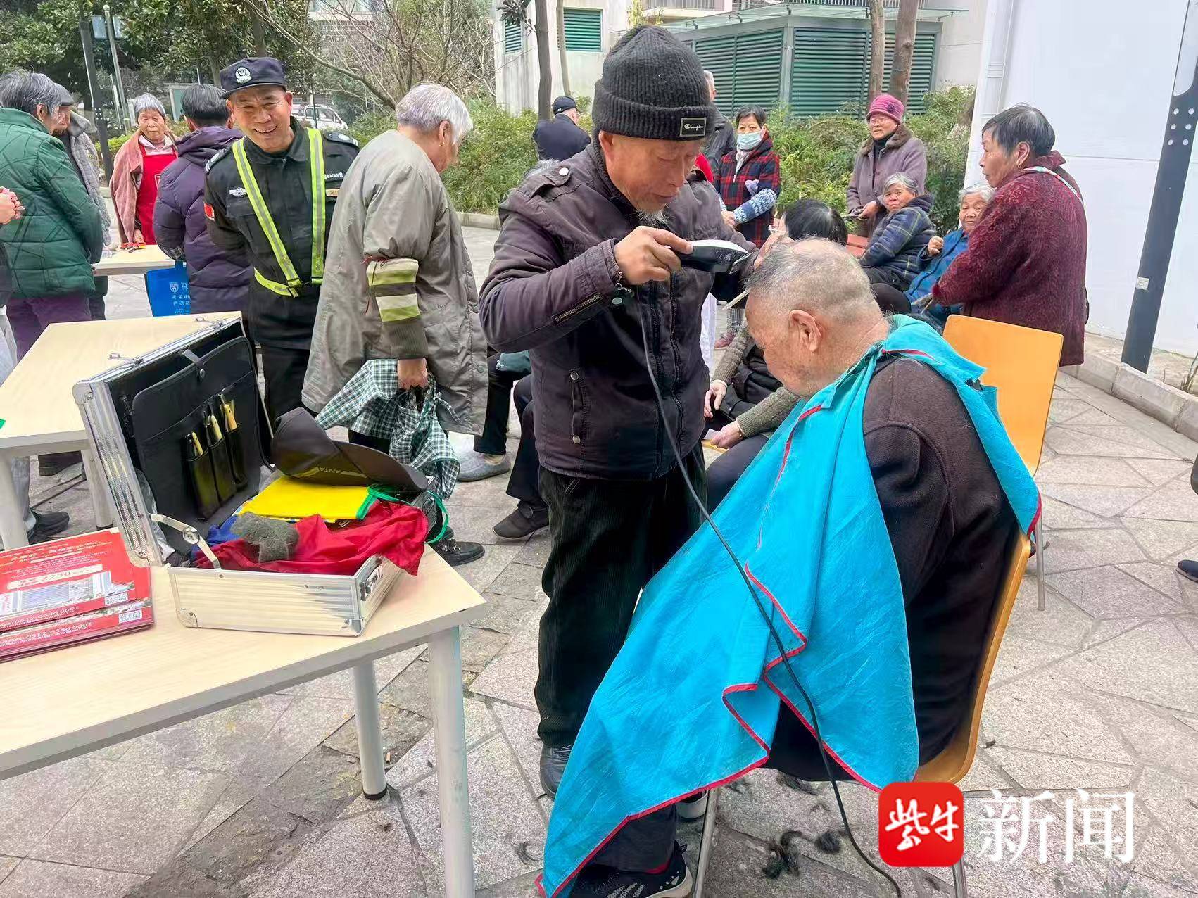 活动现场人头攒动,磨剪刀、缝补、理发、苏康养黄桥康养中心宣传等多个便民摊位有序排布,精准对接居民日常需求。其中,磨剪刀和理发摊位最受青睐,前来参与的爷爷奶奶络绎不绝。老人们纷纷表示,想趁着春节前换个清爽新发型,以全新的精神面貌迎接新年。