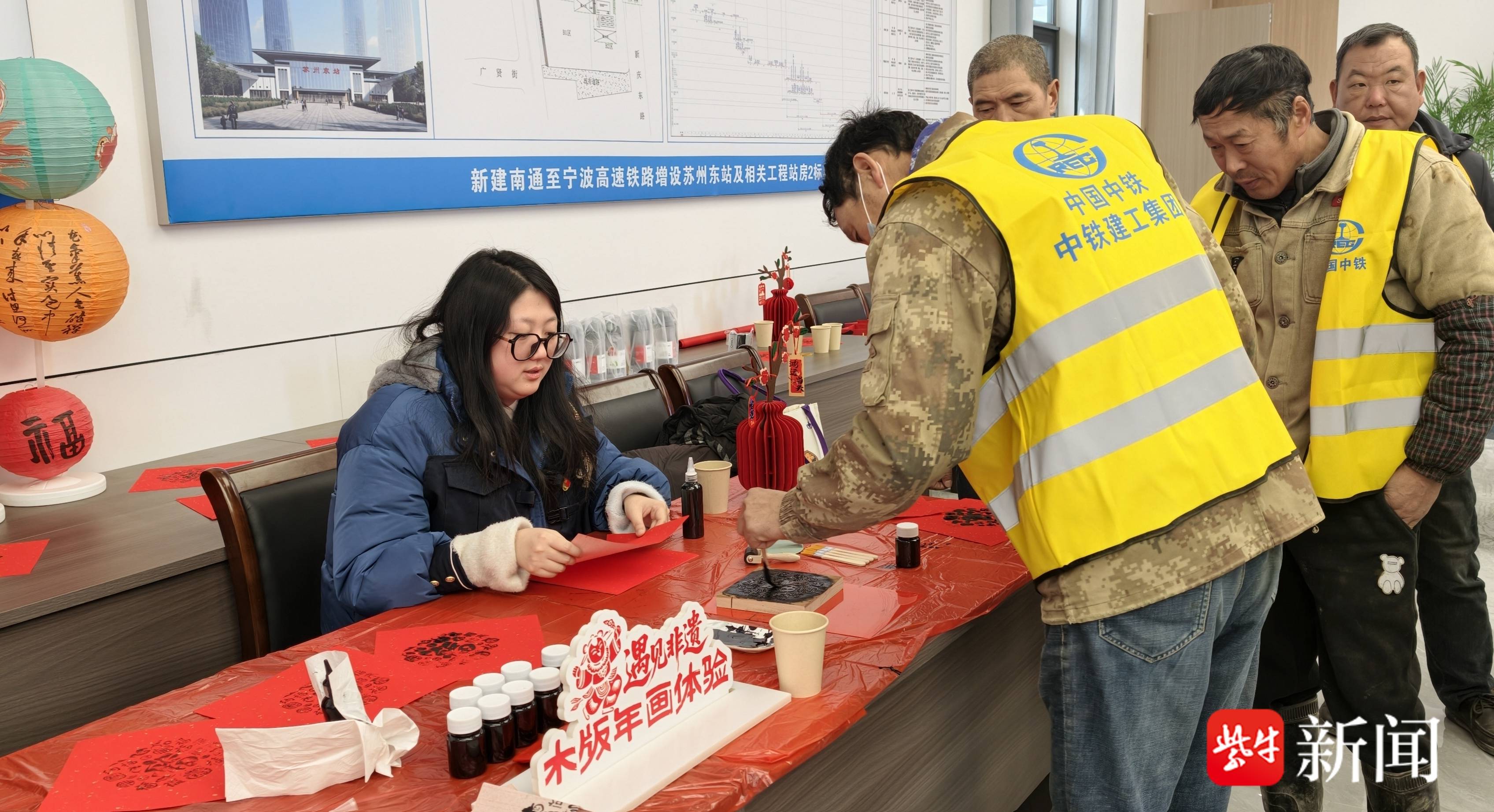 记者在现场看到,工友们在施工之余分批来到义诊现场,品着中医养生茶,一边接受各科检查。来自安徽的50岁钢筋工肖西礼测完血压等检查,“平时一直在工地忙碌,这样的义诊活动很好,感受到对我们农民工的关爱,项目部很关注我们的身体。”义诊之余,肖师傅还饶有兴趣地亲手体验了苏州非遗桃花坞木版年画,开心地将印满福字的年画带回去迎接新春。“这也是提前感受到了苏州浓浓的年味!”